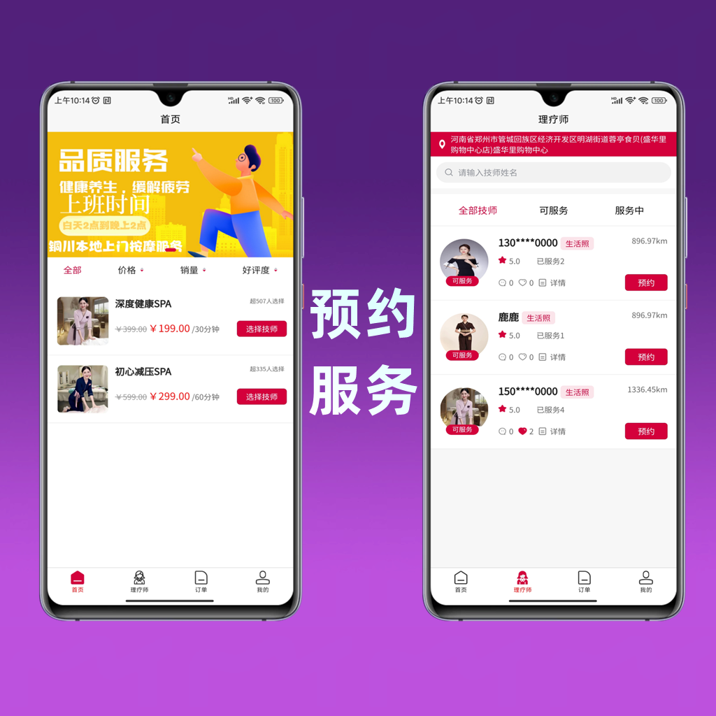 用户端:项目列表、项目详情、选择下单;城市定位、技师列表、评价、详情,收藏技师、选择下单;订单列表、分类订单列表、订单详情、退款/评价;账户余额、优惠券卡包、充值消费记录、推广邀请、团队列表、投诉举报、退款订单列表、收藏技师、申请技师、地址管理、联系客服。