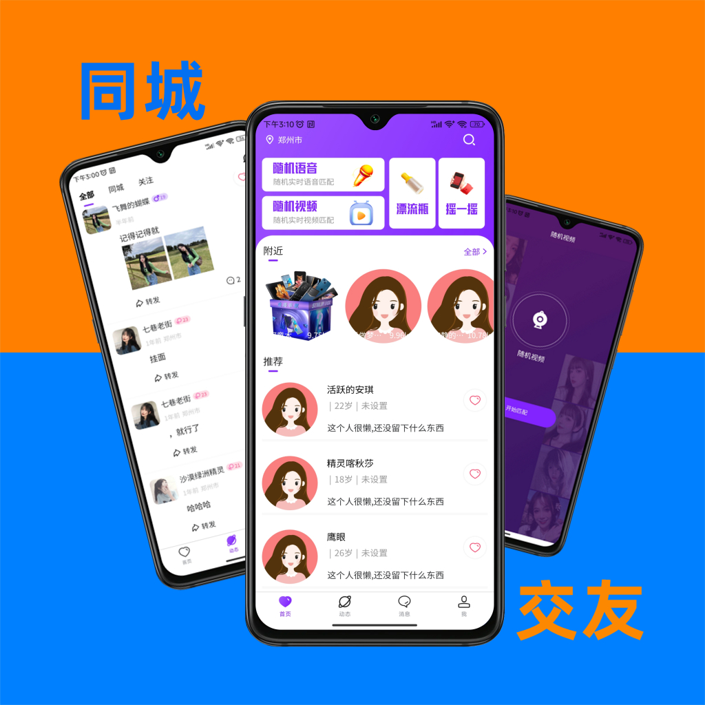 功能点: 随机语音,随机视频,漂流瓶,摇一摇,动态点赞及评论,动态发布,基本信息介绍,语音介绍,认证标识,标签标识,礼物窗,聊一聊,搭讪,关注,邀请返佣,VIP会员权限,任务奖励中心,美颜设置,收费设置等。