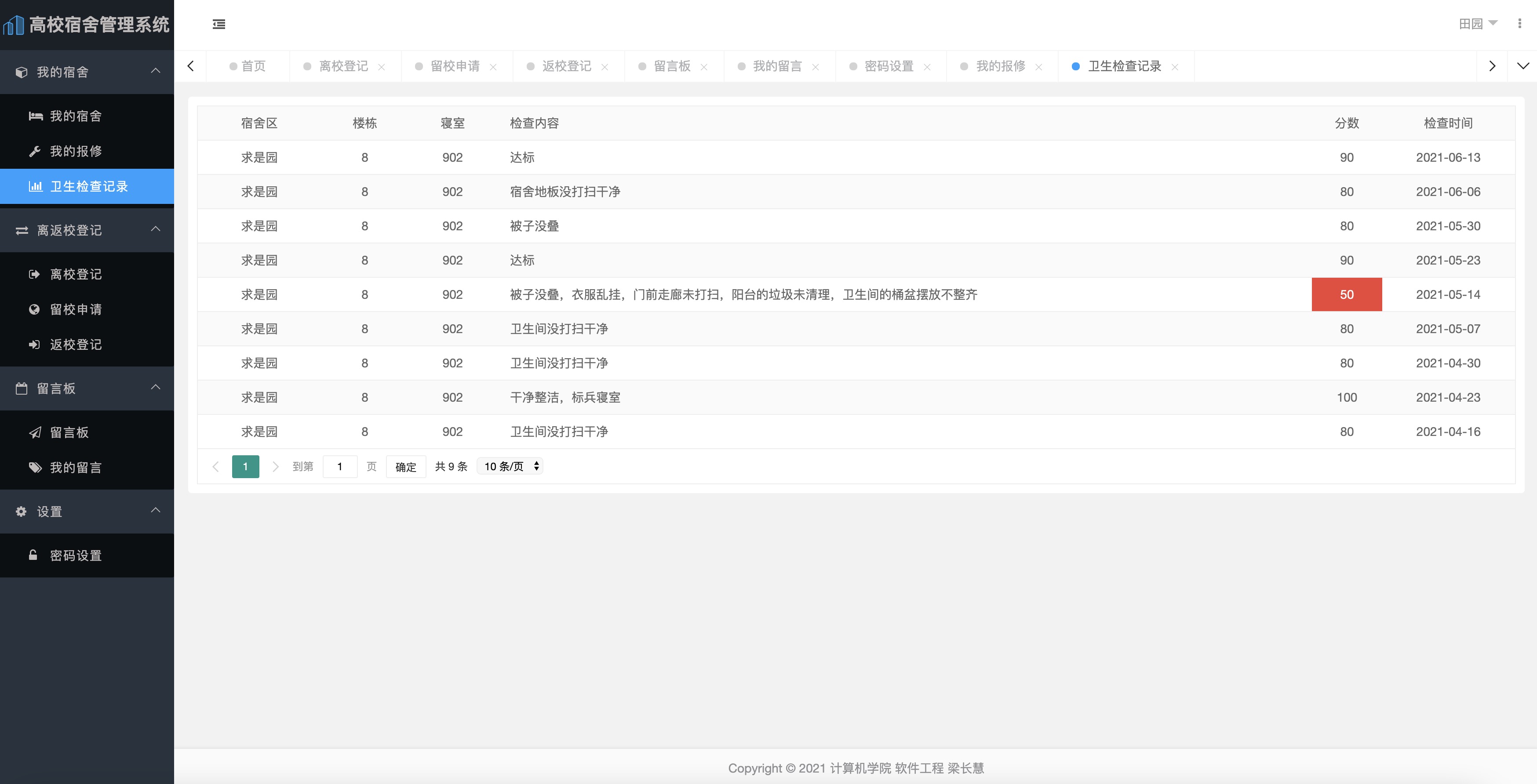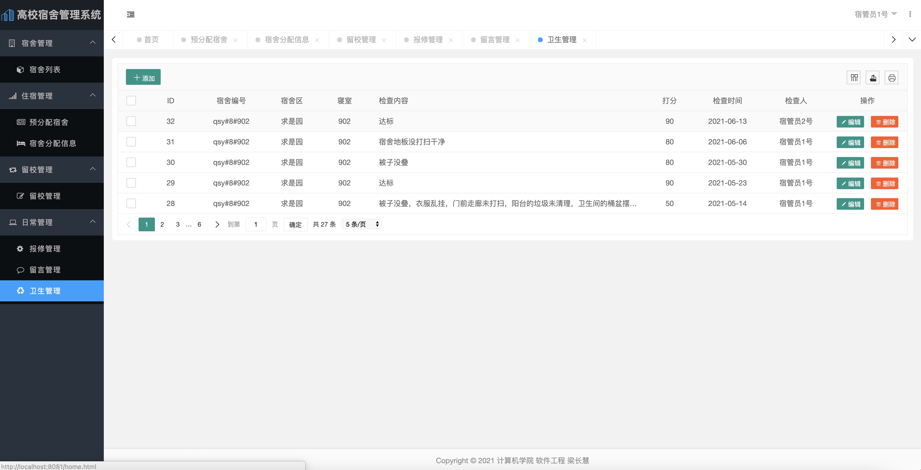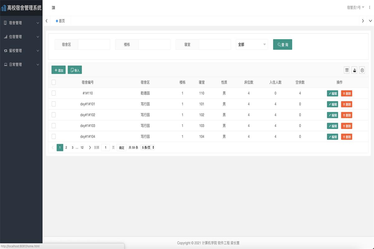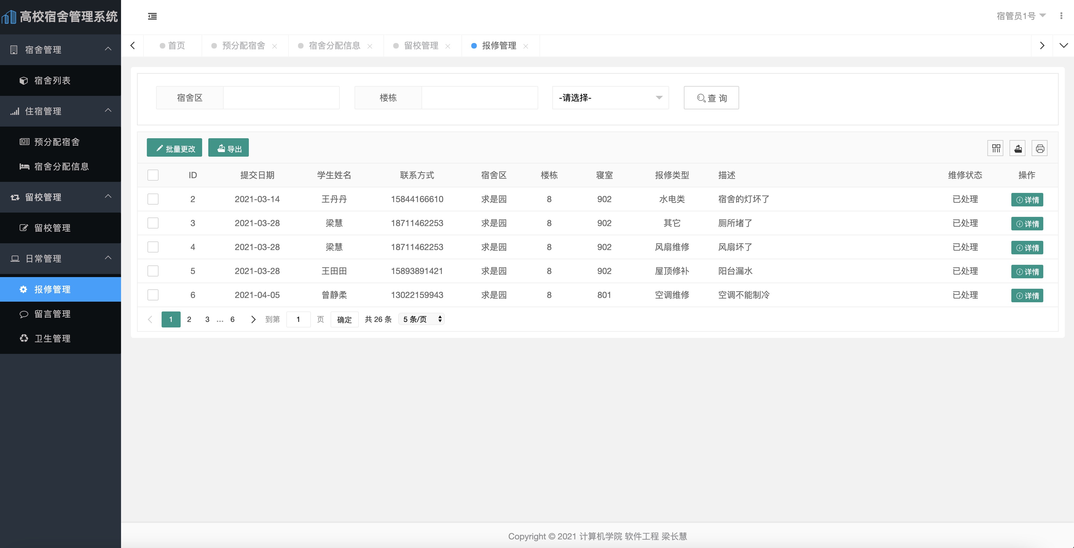 包括查找学生信息、各楼栋/专业的学生宿舍分配情况、卫生检查情况、学