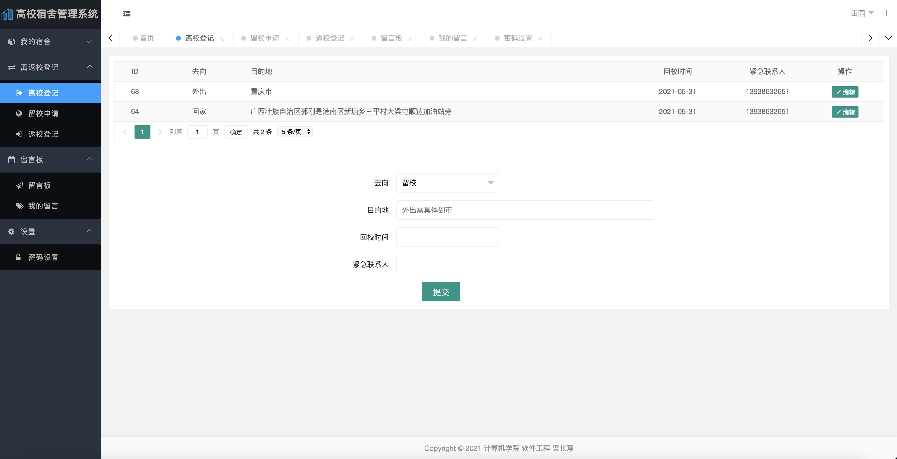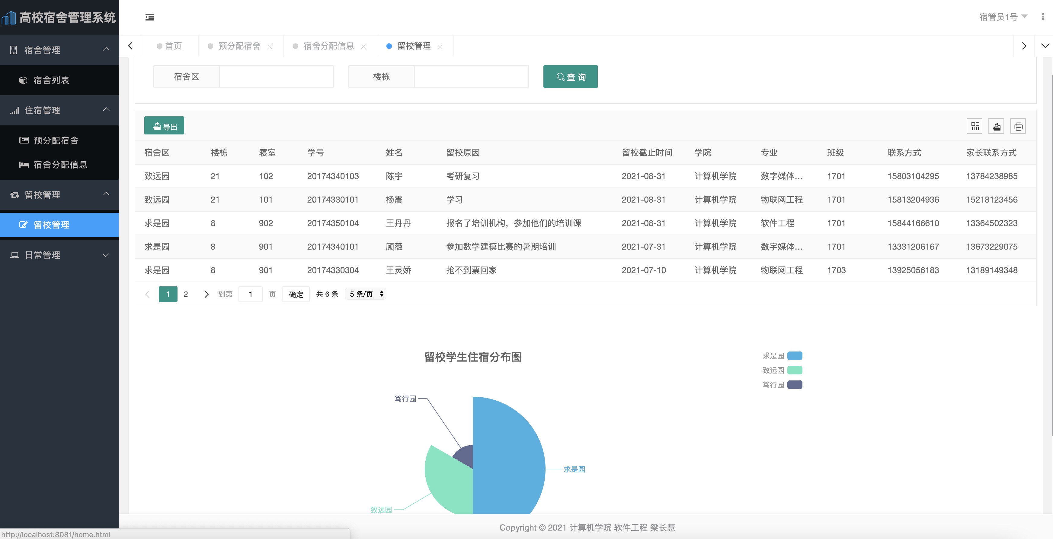 生离返校及留校信息、指定类型的留言、查看宿舍成员等。