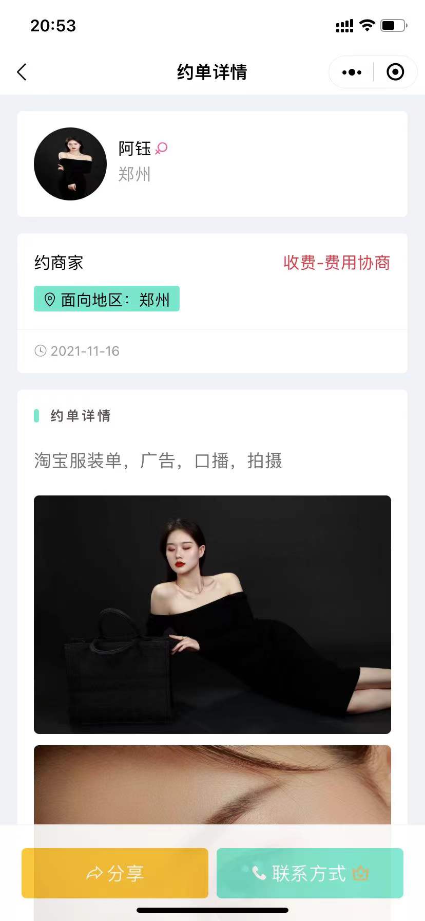 用户约单:模特、礼仪、红人可在平台发布约单内容,相关从业人员可查看发布者联系方式。