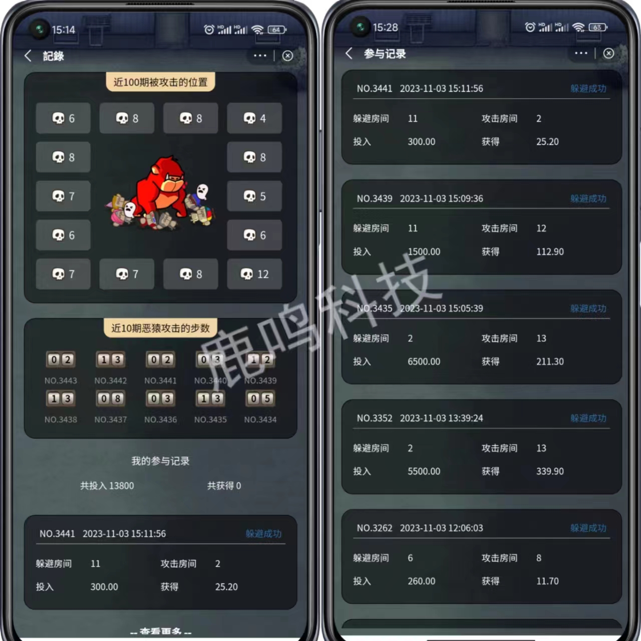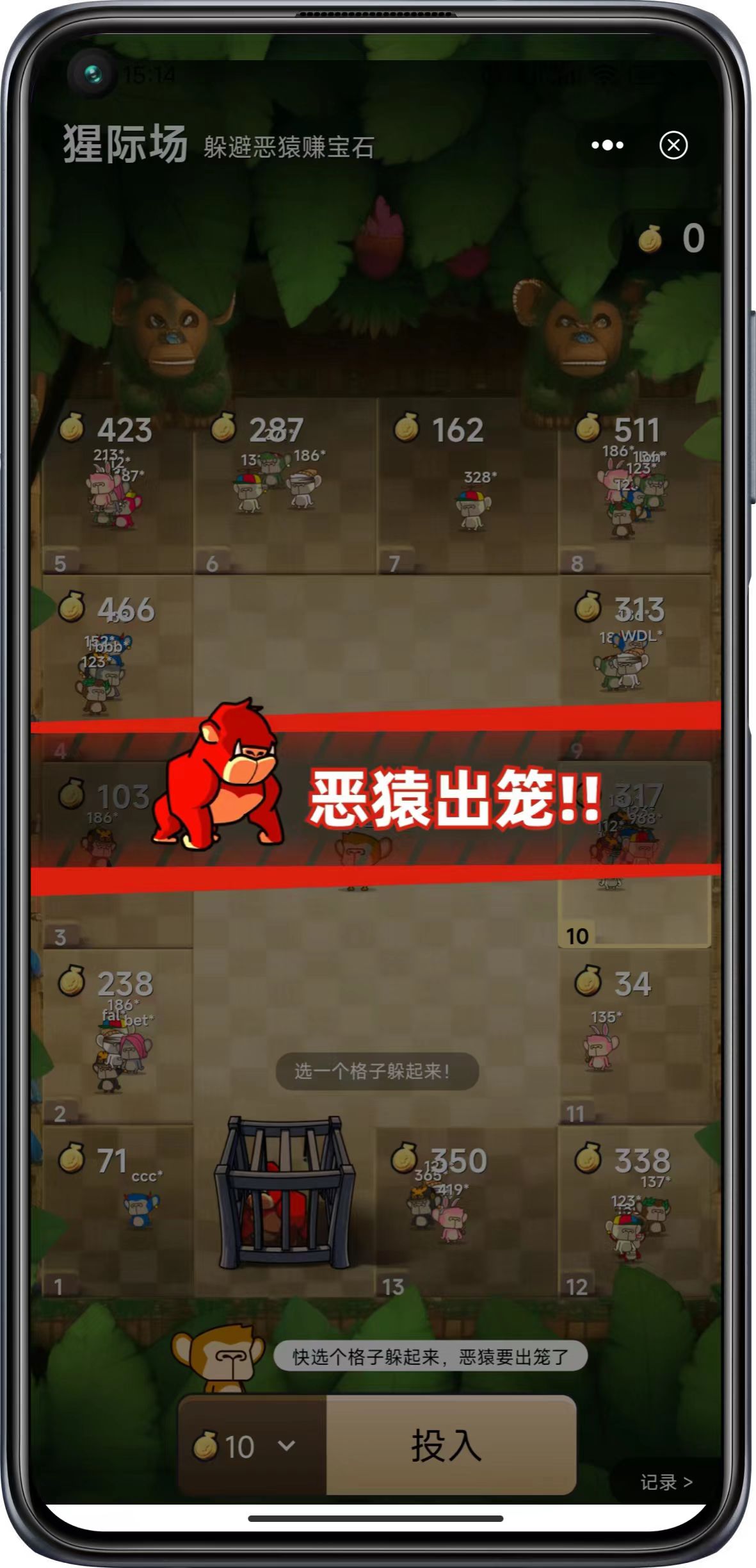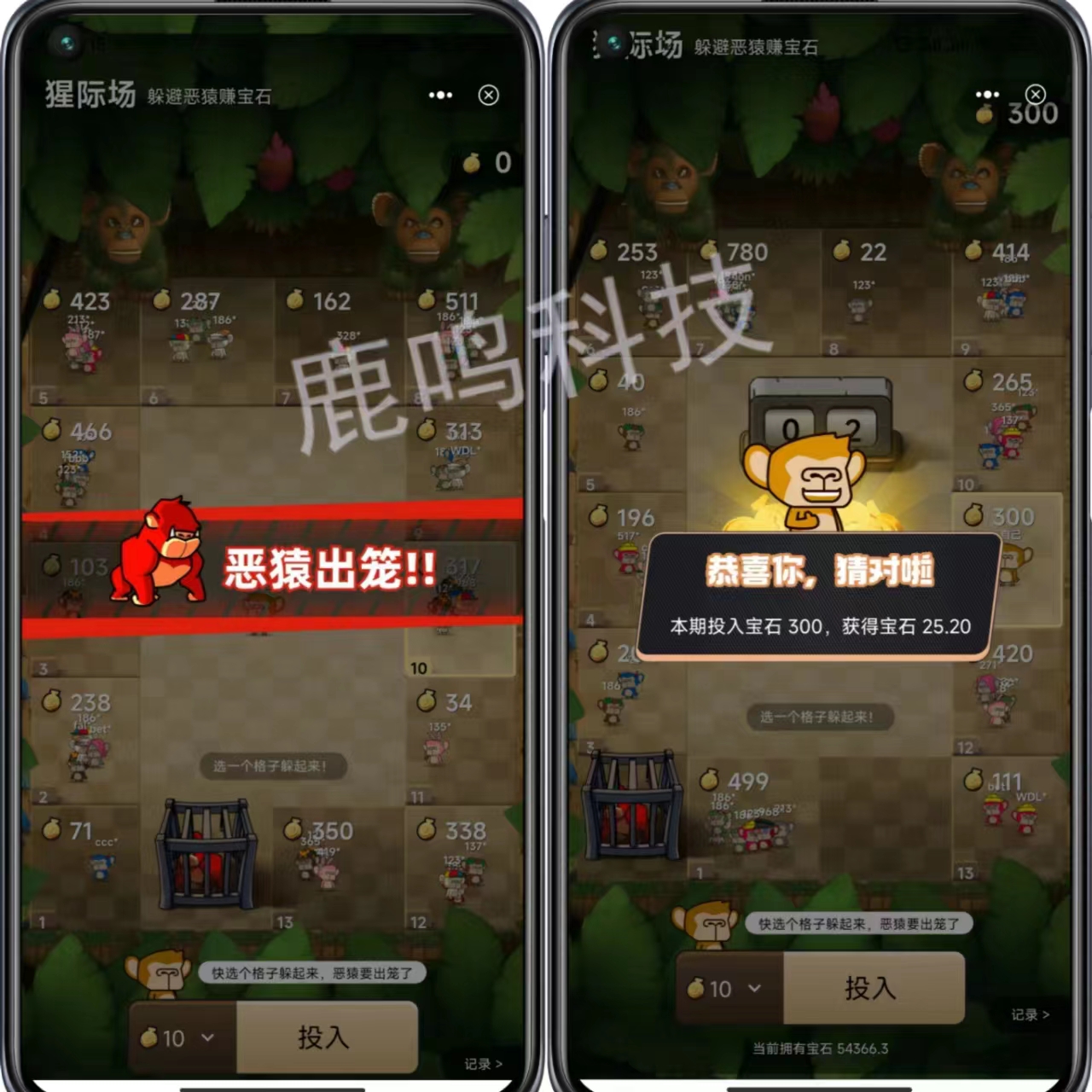 玩家选择一个格子躲避恶猿,满足人数后恶猿会按随机数顺时针前行,在某个格子停留后杀死里面所有参与者,其他格子的幸运者平均瓜分被杀者的宝石。