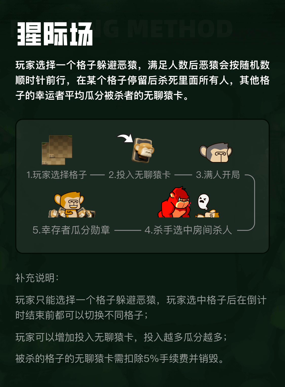 玩家可以增加投入无聊猿卡,投入越多瓜分越多;被杀的格子的无聊猿卡需扣除5%手续费并销毁。