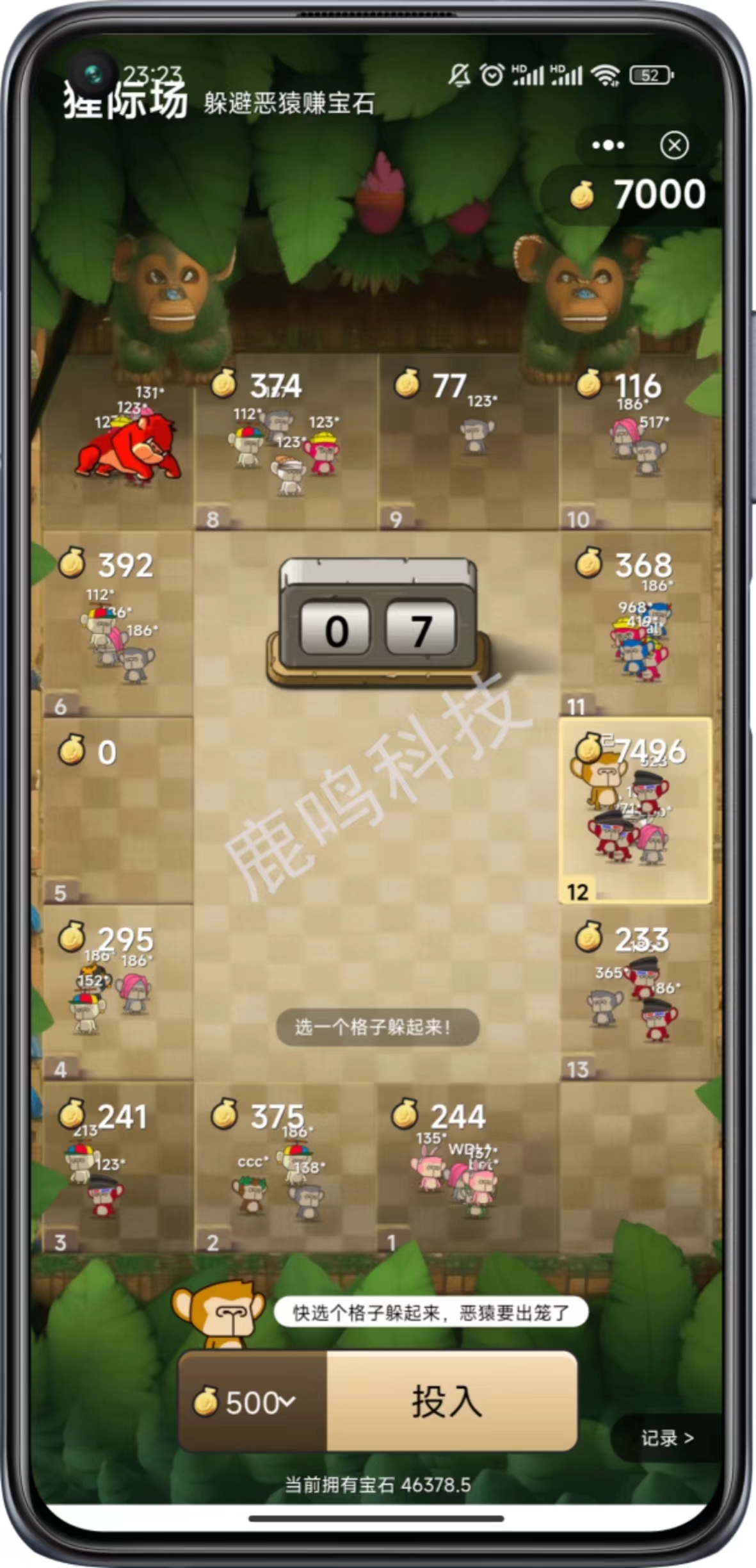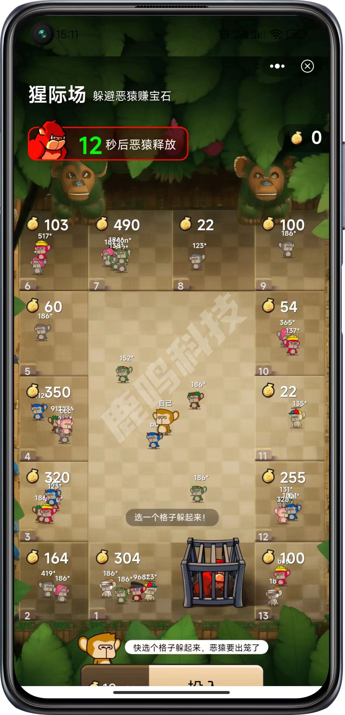 玩家只能选择一个格子躲避恶猿,玩家选中格子后在倒计时结束前都可以切换不同格子;