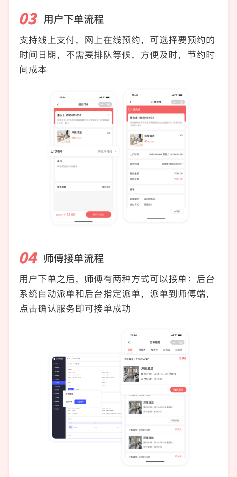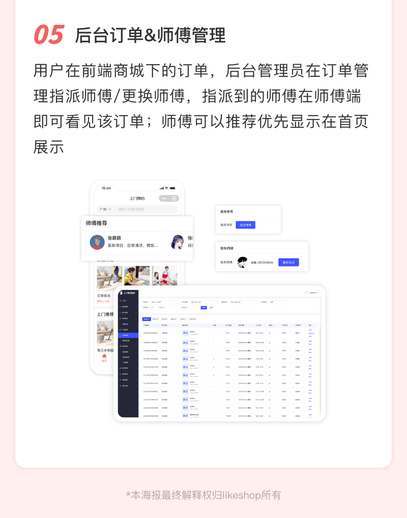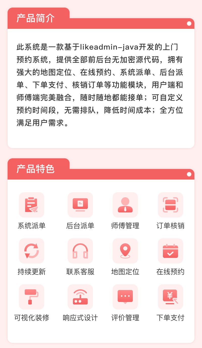 此系统是一款基于likeadmin-java开发的上门预约系统,提供全部前后台无加密源代码,拥有强大的地图定位、在线预约、系统派单、后台派单、下单支付、核销订单等功能模块,用户端和师傅端完美融合,随时随地都能接单;可自定义预约时间段,无需排队,降低时间成本;全方位满足用户需求。