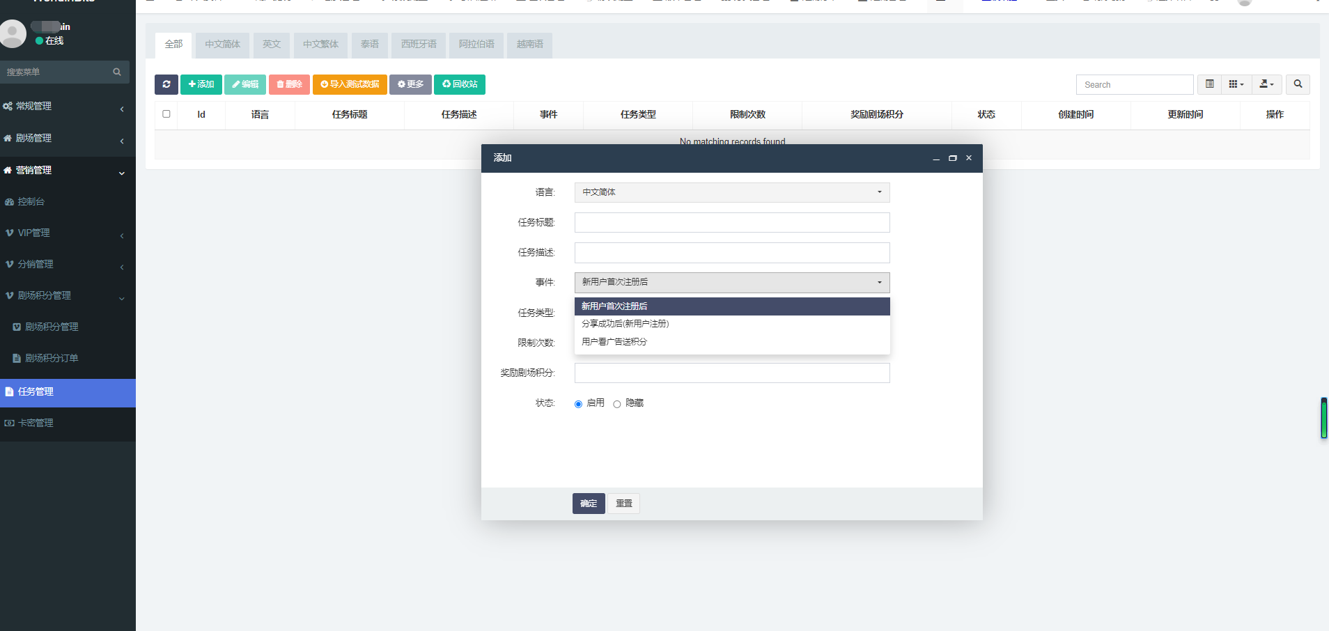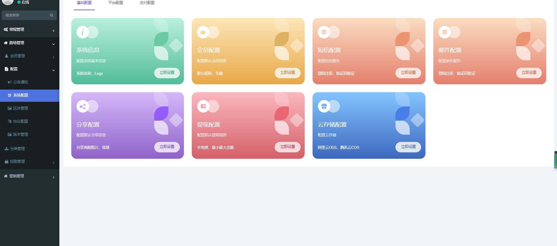 1.Saas无限多开,APP版本可后台一键管理 2.多语言配置,前台自由切换。系统内置:中文、英文、泰语、西班牙语。 3.一键导入视频,一键设置积分 4.支持Android、IOS、H5 5.支持邮箱登录、海外手机号登录。 6.支持PayPal国际支付 7.分销功能、卡密功能、提现功能、自动切换播放。详看功能文档 8.穿山甲广告对接