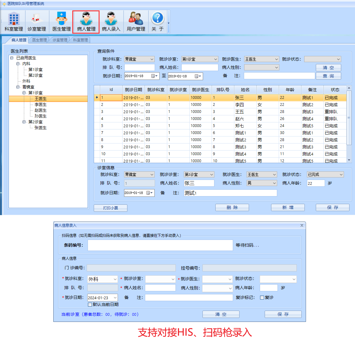 1. 登录分诊管理客户端后,在主界面的菜单中点击【病人管理】,进入病人管理界面。