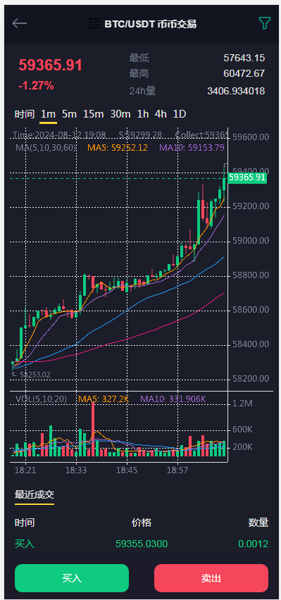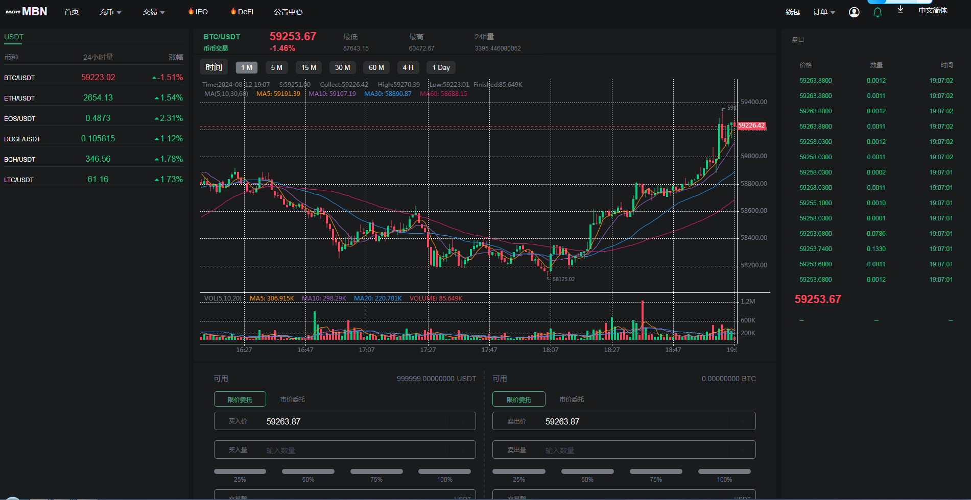 功能上包含币币、IEO等,具体可以看演示平台,K线行情数据对接的是bihuo接口,可以自行替换。