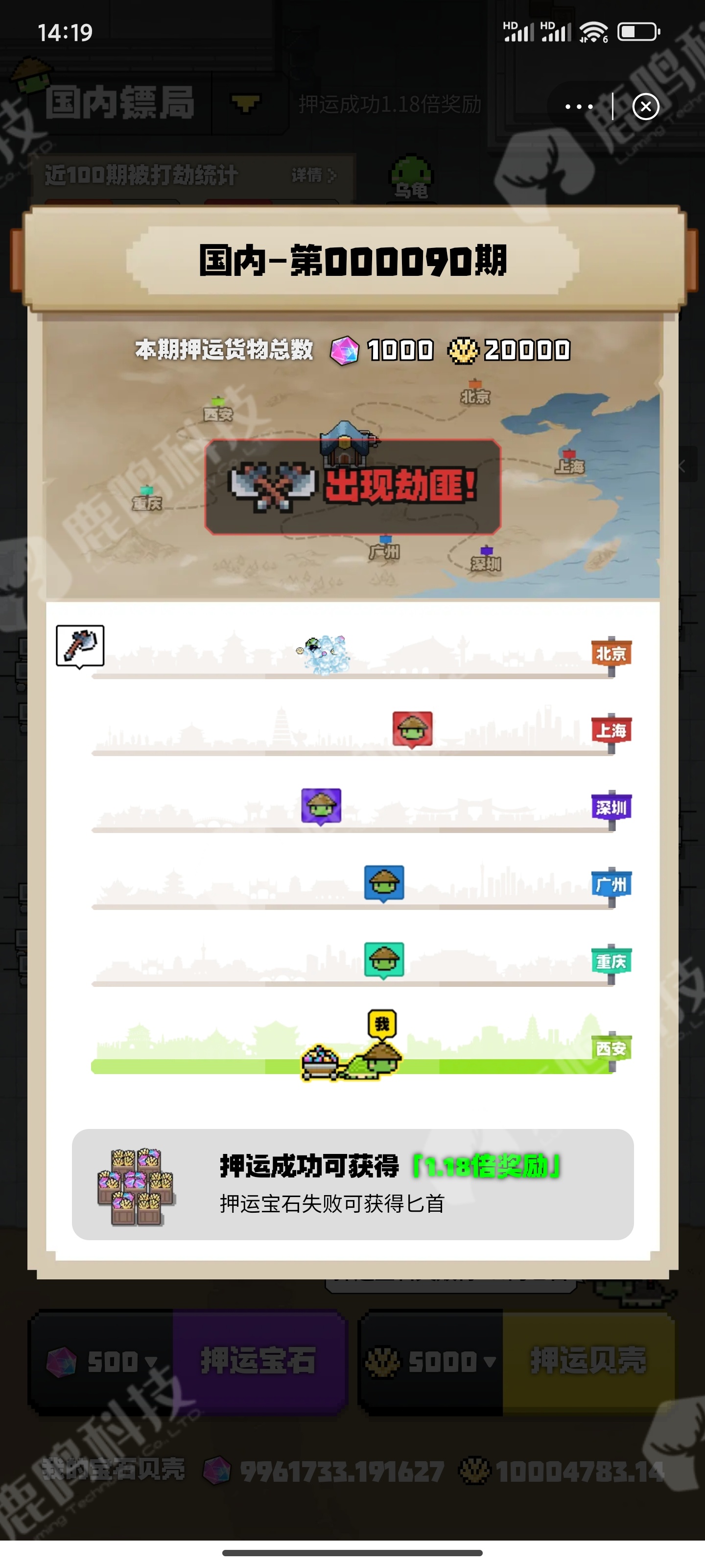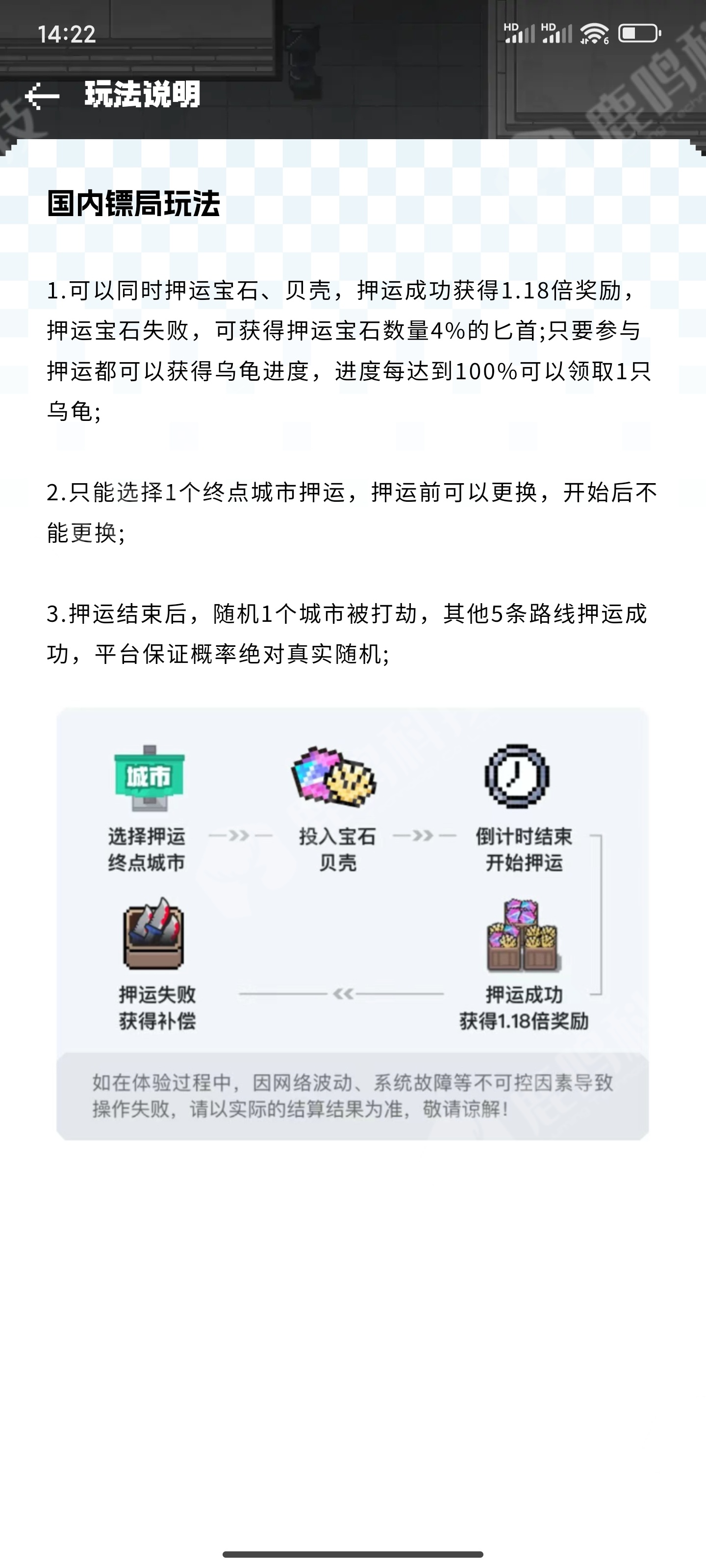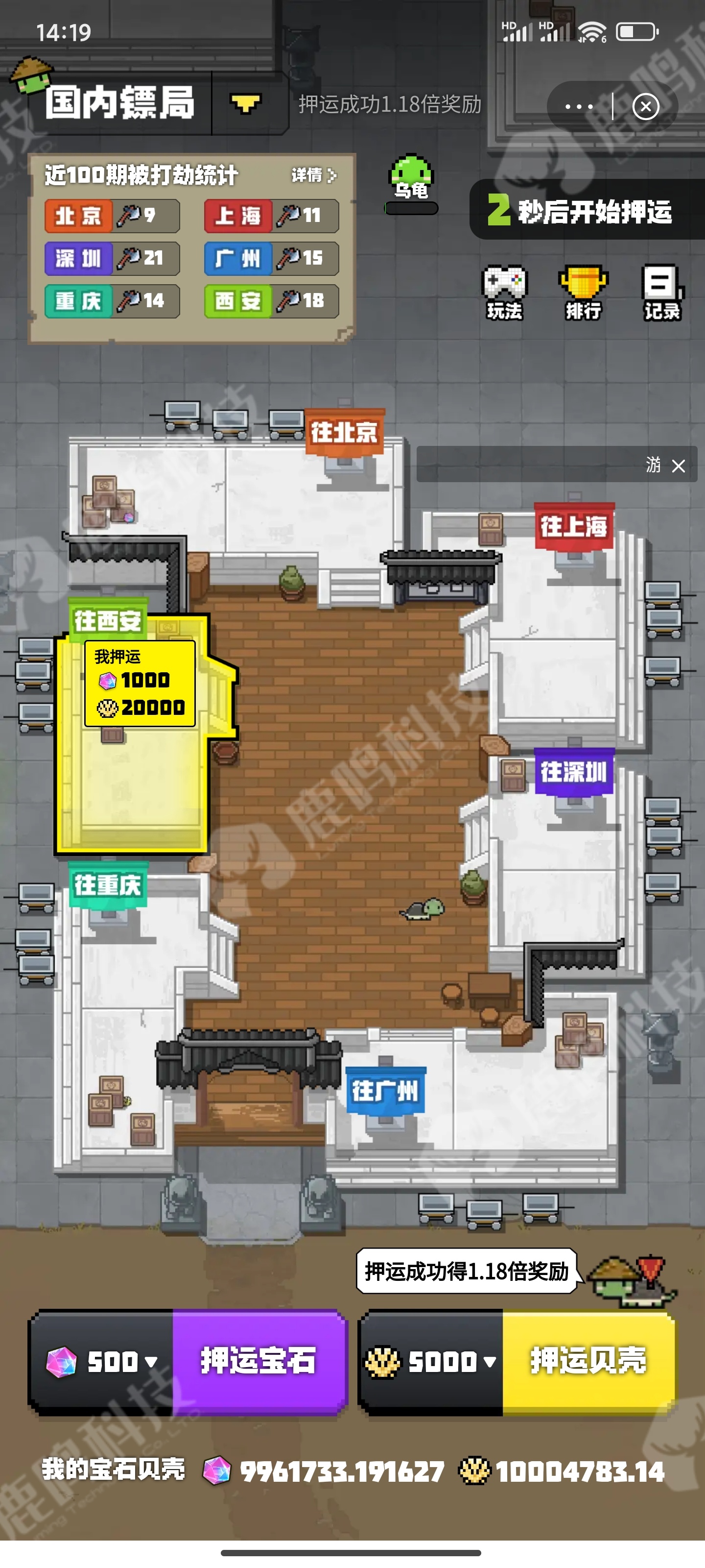 1.可以同时押运宝石、贝壳,押运成功获得1.18倍奖励押运宝石失败,可获得押运宝石数量4%的匕首;只要参与押运都可以获得乌龟进度,进度每达到100%可以领取1只乌龟;