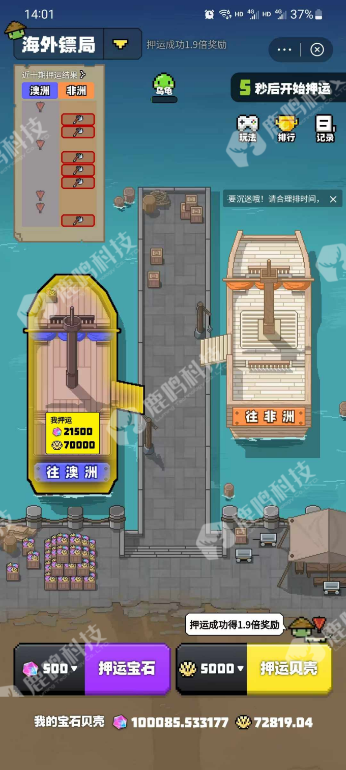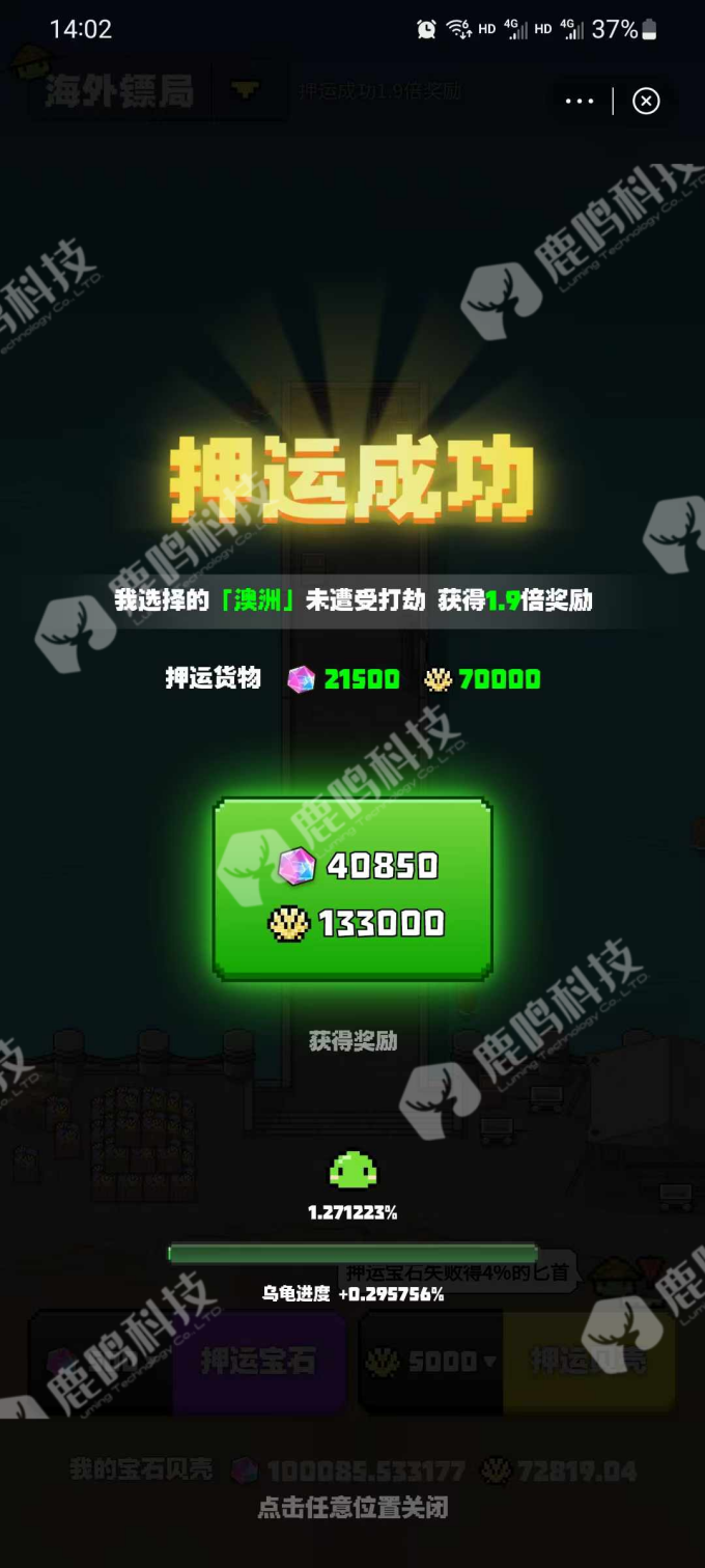 1.可以同时押运宝石、贝壳,押运成功获得1.9倍奖励,押运宝石失败,可获得押运宝石数量4%的匕首:只要参与押运都可以获得乌龟进度,进度每达到100%可以领取1只乌龟