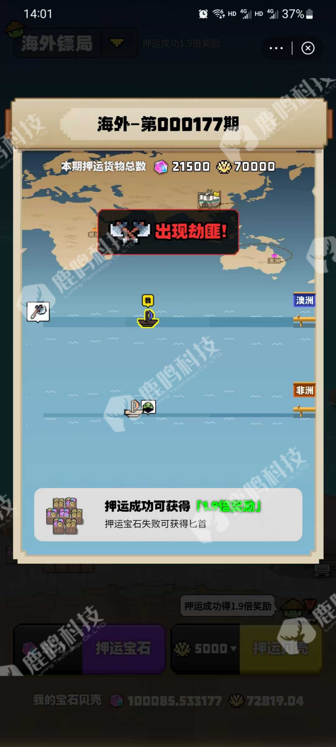 3.押运结束后,随机1个大洲被打劫,另外一个押运成功:平台保证概率绝对真实随机;