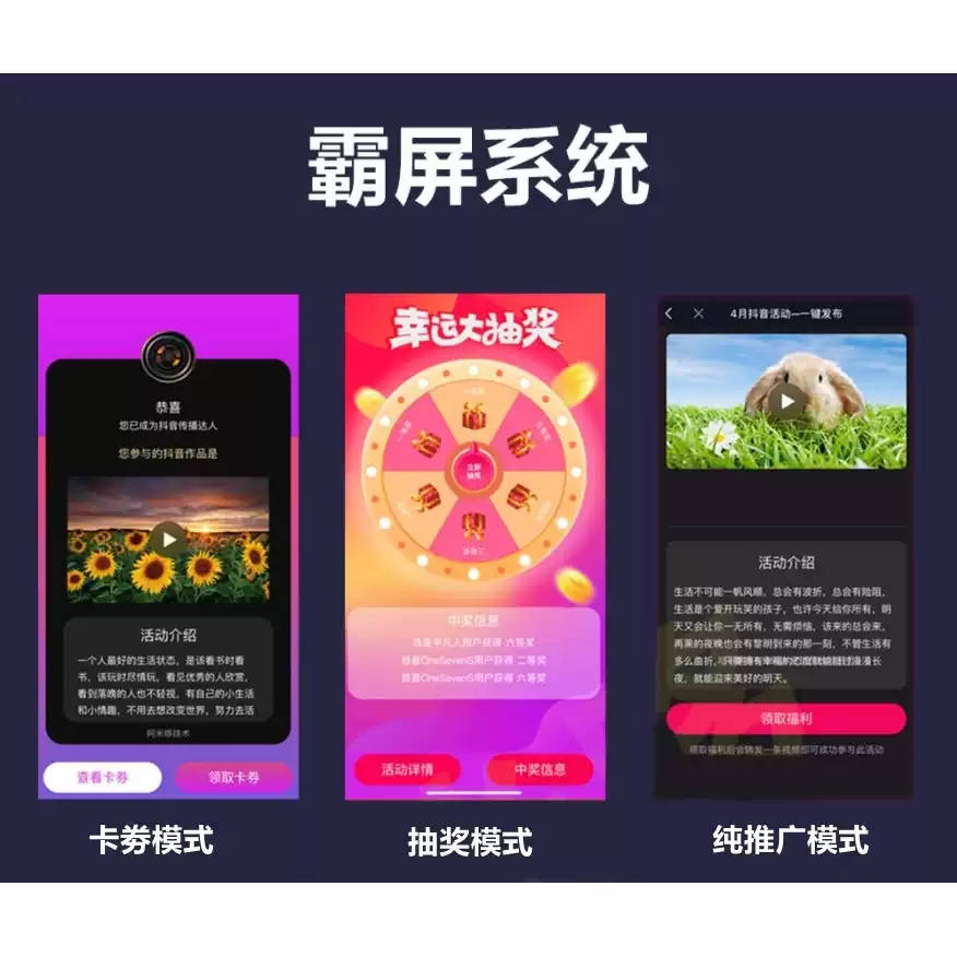 三种发布方式:1、一键发布模式。2、扫码领券模式。3、大转盘模式。