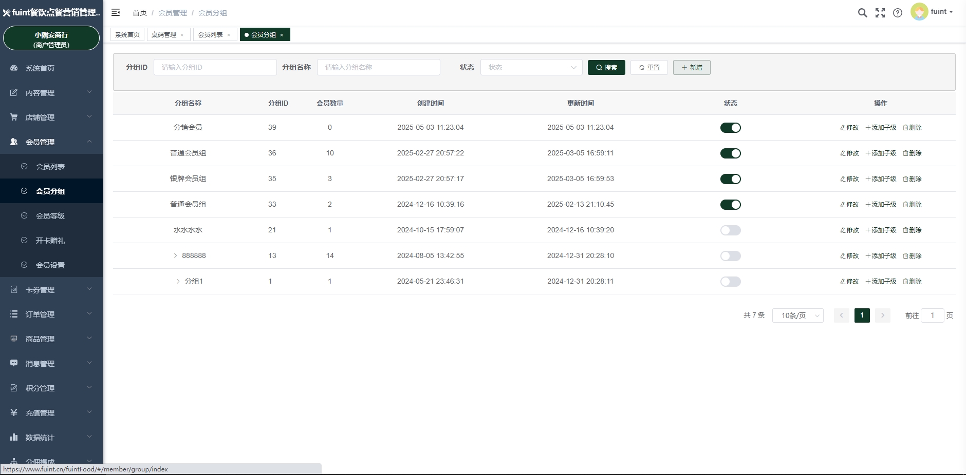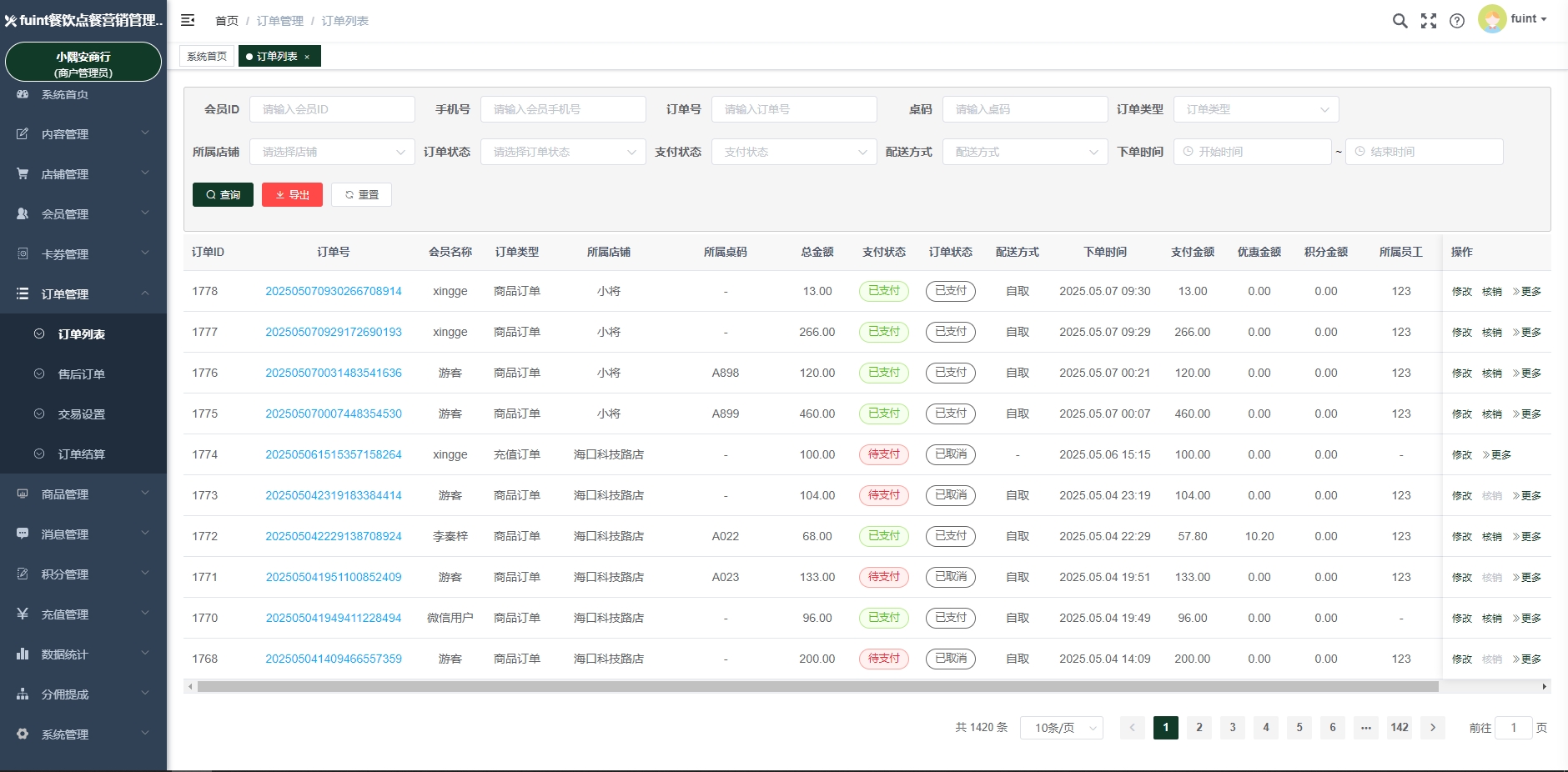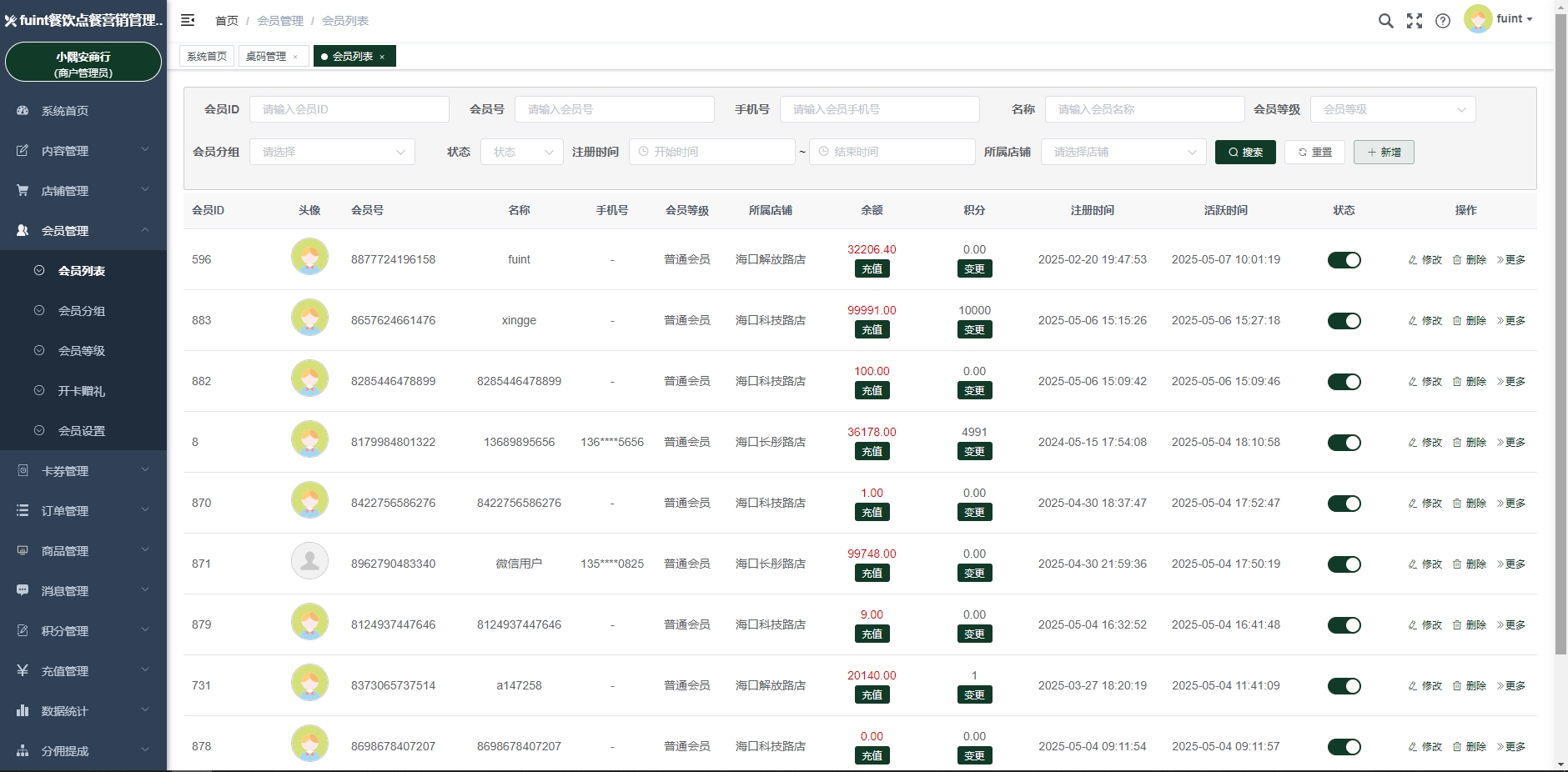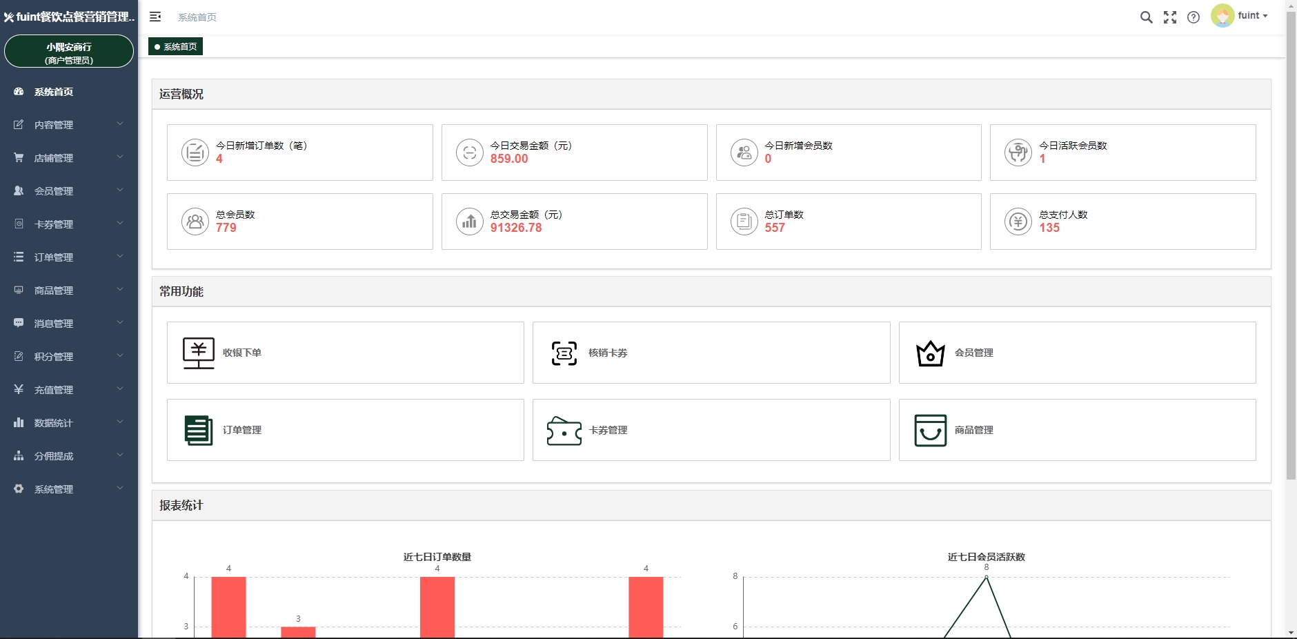 fuint会员营销系统是一款轻量级的会员系统,功能完善、系统安全稳定、简单易用、支持多门店接入,满足您多方位的会员营销活动需求。既适用于中小互联网企业也适用于线下实体门店。