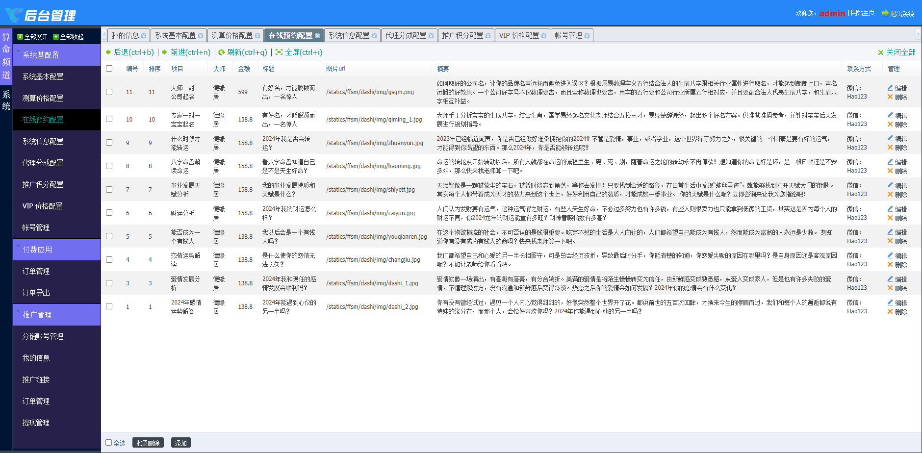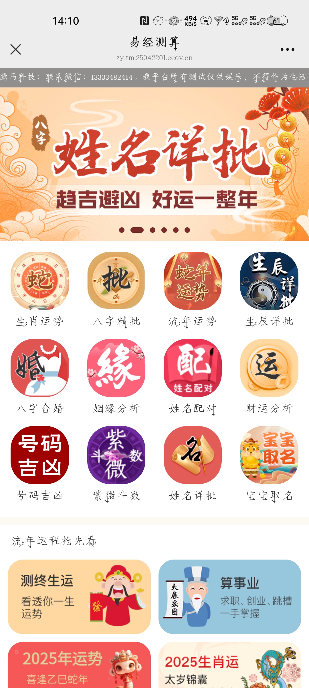 八字精批、事业财运、姓名分析、宝宝起名、姓名配对、综合详批、姻缘测算、八字合婚、紫微斗数、龙年运程、月老姻缘、号码解析、塔罗运势、塔罗爱情等。