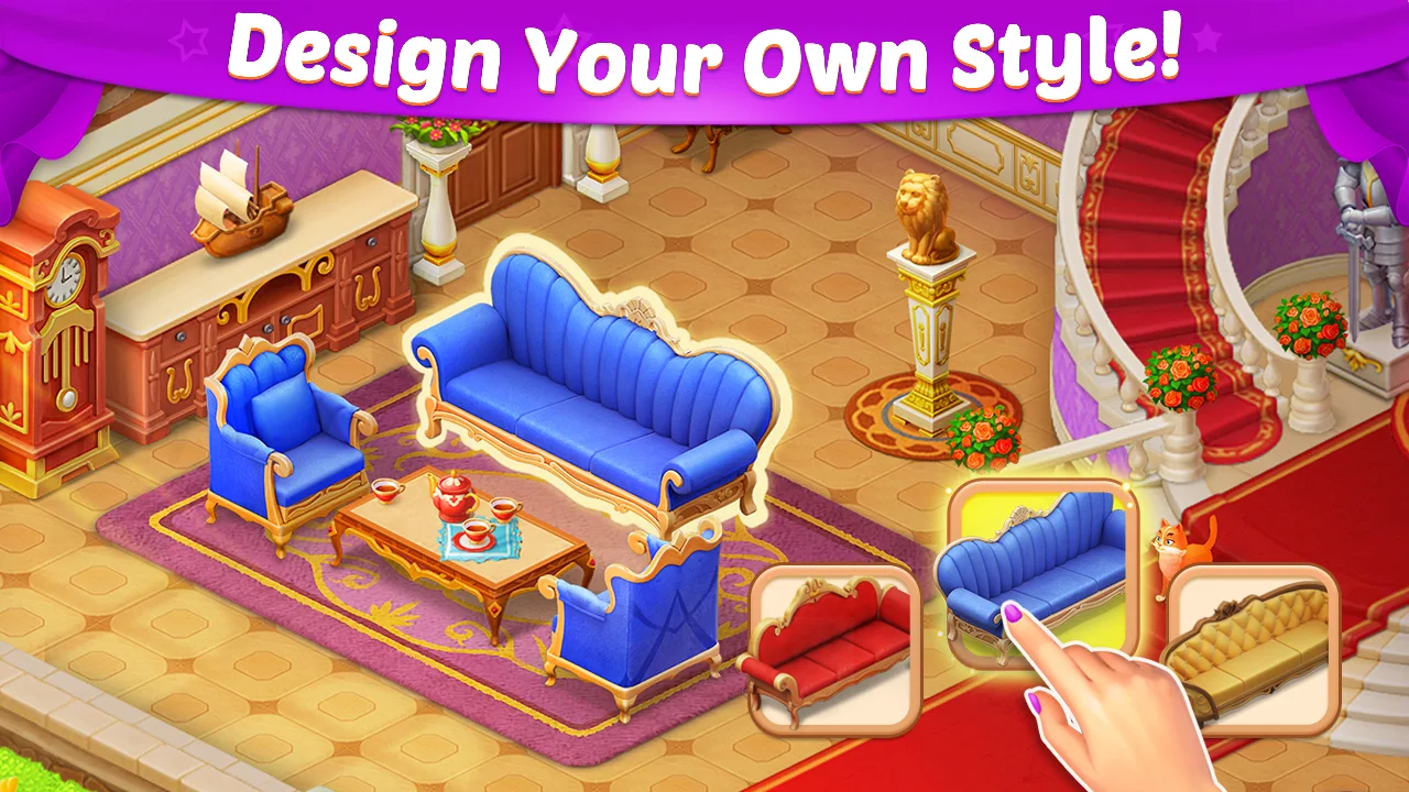 完成三消关卡来装饰和修复城堡,每个房间都配有大量华丽家具和精致摆件可供选择,包括你的私人浴室和内庭花园。