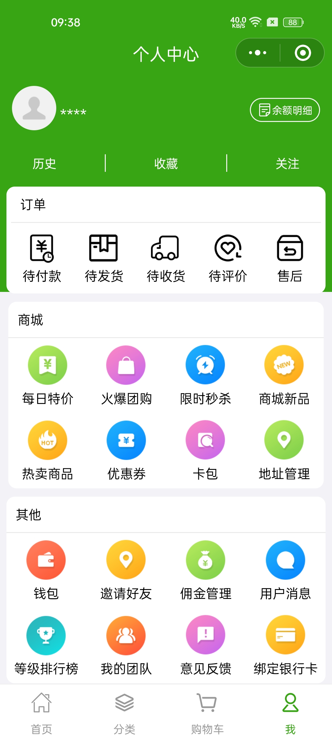3、功能模块:商城,分销,多商家,拼团,秒杀,官网,卡券,同城O2O,超市,外卖,预约,门店,导航,内容管理,自动打印,群接龙,弹窗广告,配送,团长管理等等。
