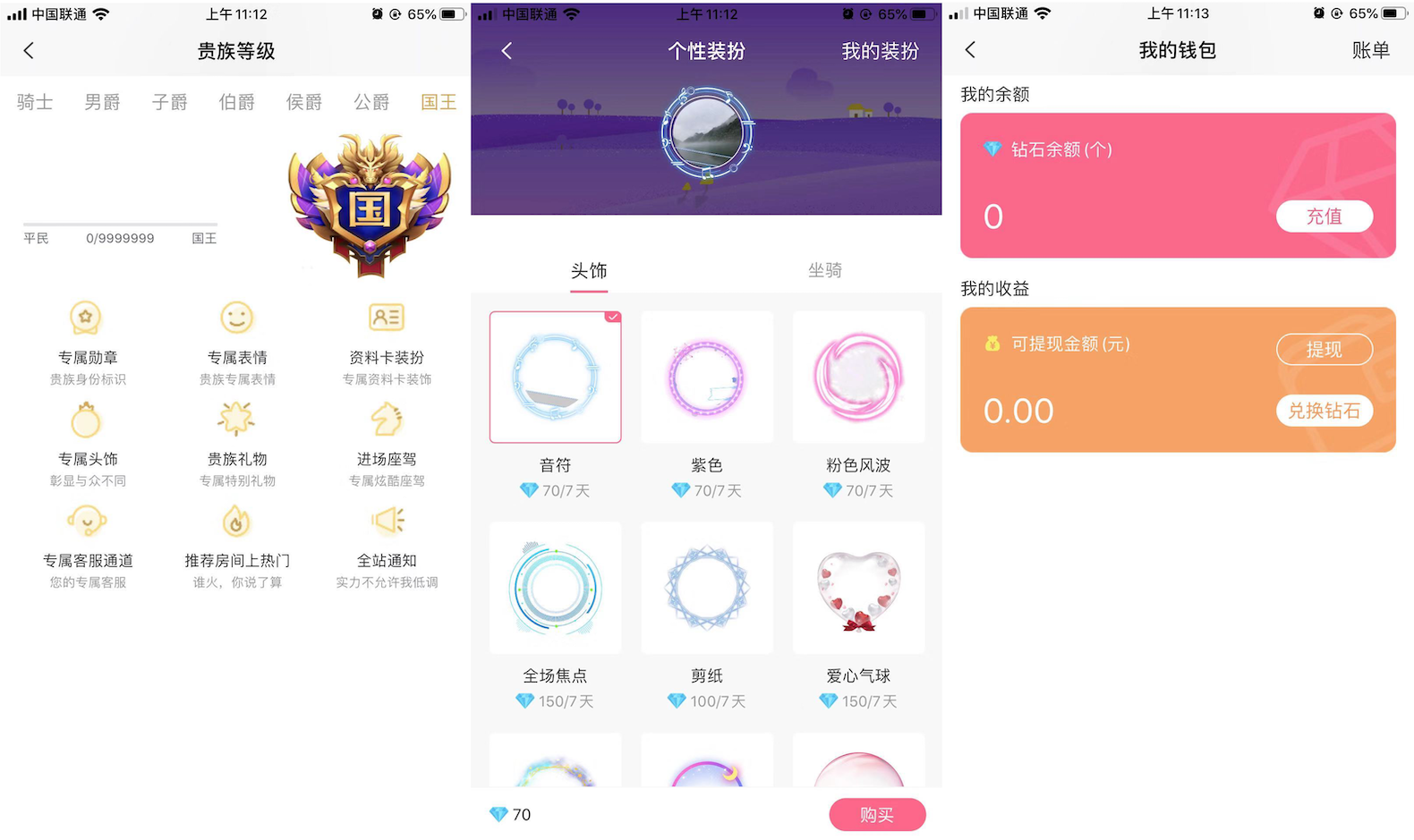 9.我的钱包可以查看到自己的钻石余额、金币余额和可提现的金额。