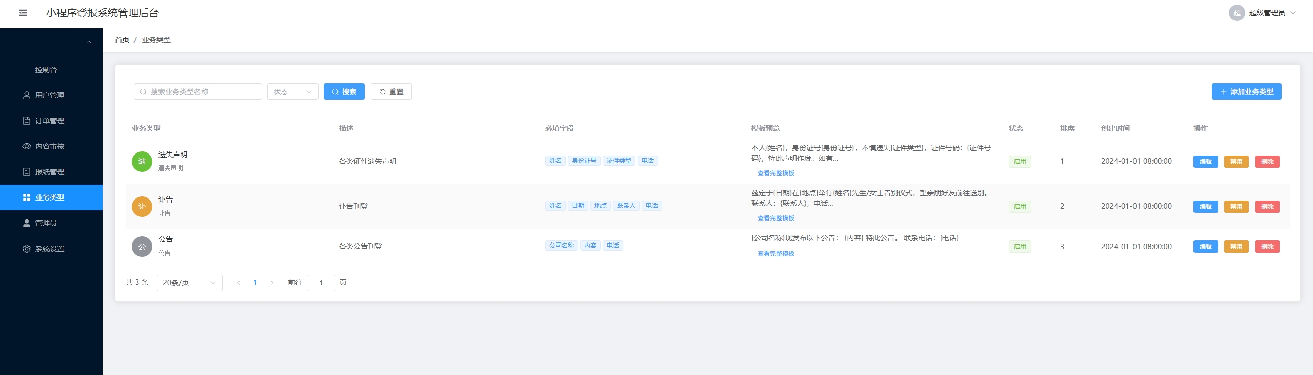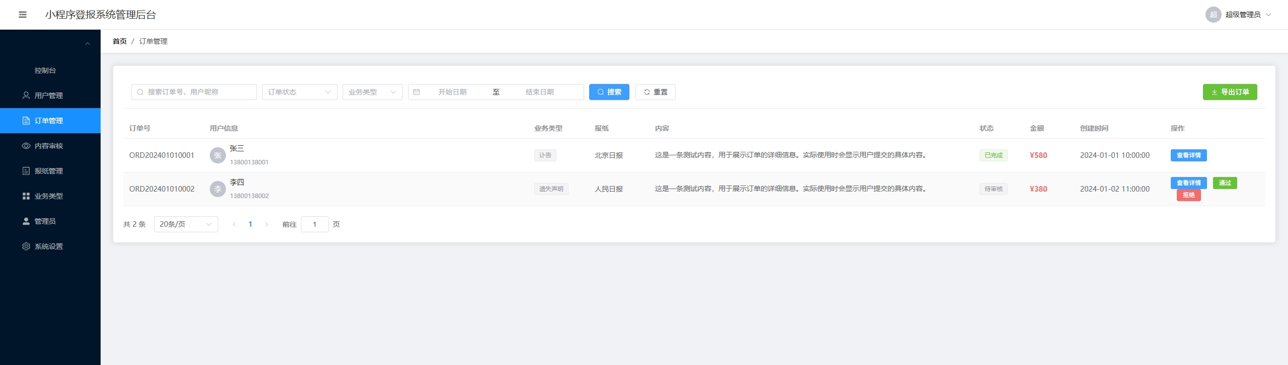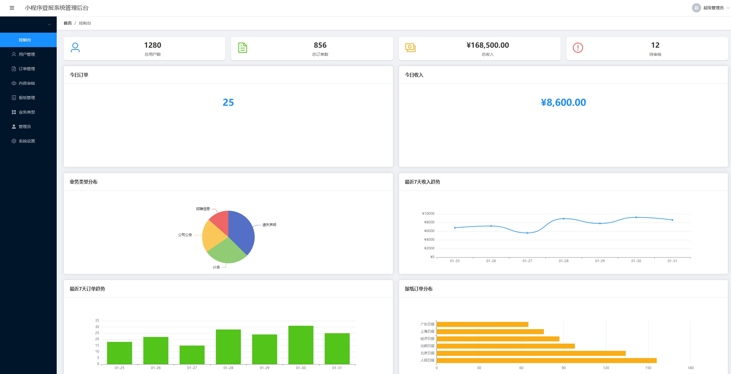 统管理后台,提供了用户管理、订单管理、内容审核、报纸管理、业务类型管理等全套功能。