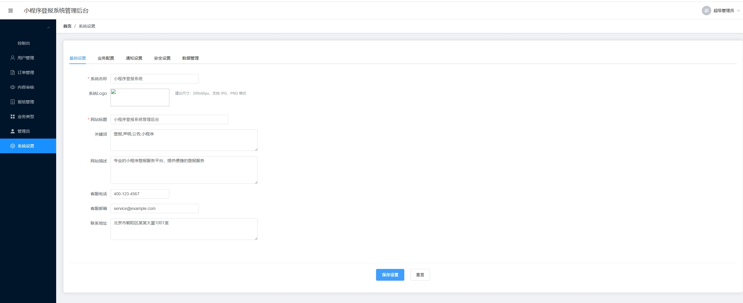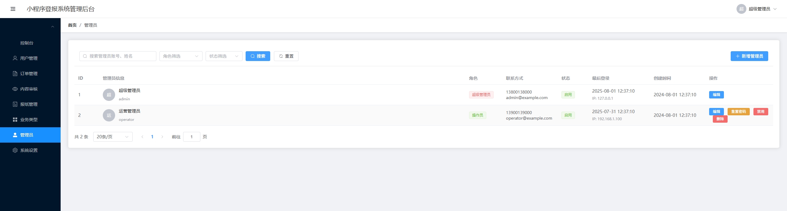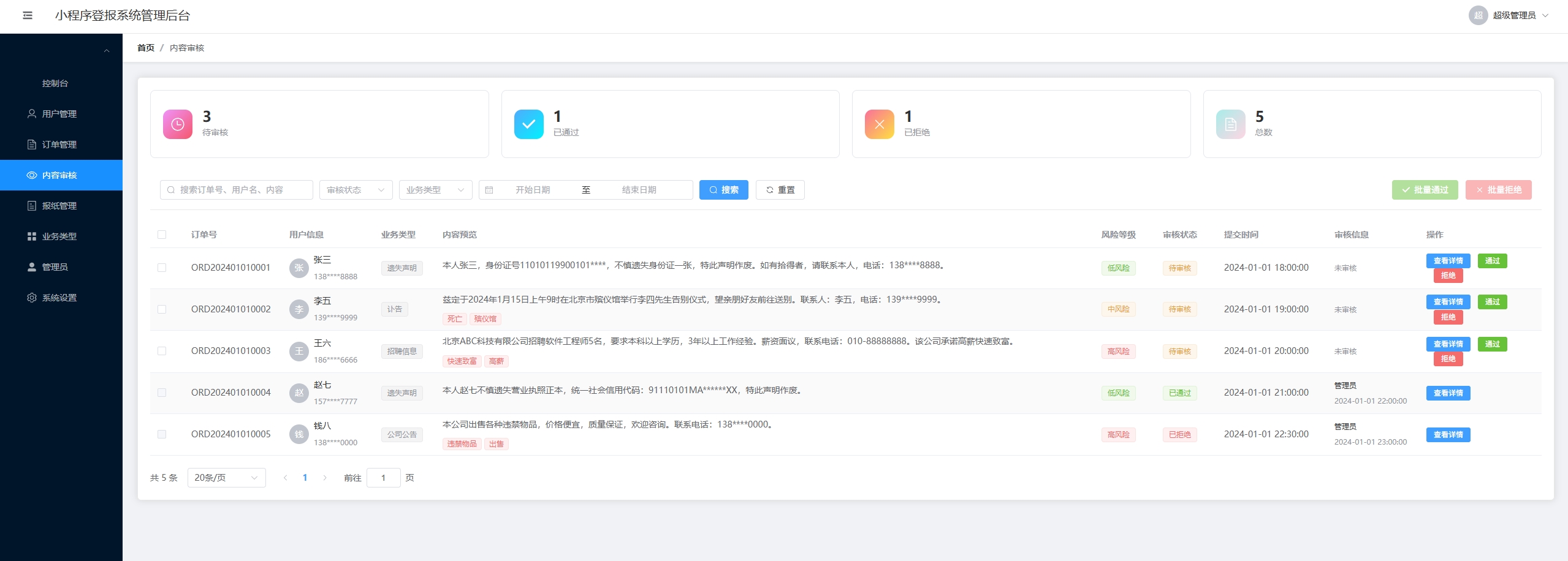 统管理后台,提供了用户管理、订单管理、内容审核、报纸管理、业务类型管理等全套功能。