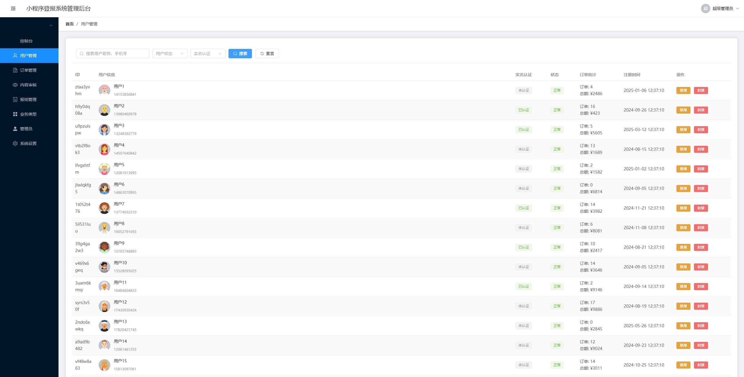 用户管理:用户列表、状态管理、实名认证查看