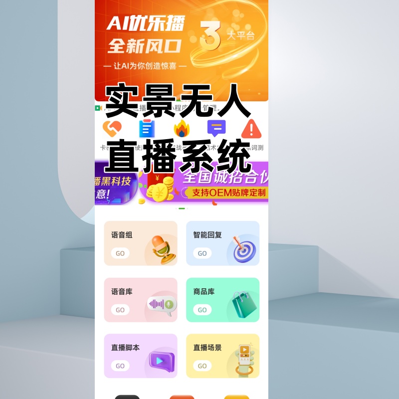 无人直播系统内置智能讲解功能,通过预设脚本或AI生成内容,自动完成商品介绍、活动推广等直播核心环节。无需人工实时操作,系统可模拟真人语调与节奏,确保直播内容流畅自然。
