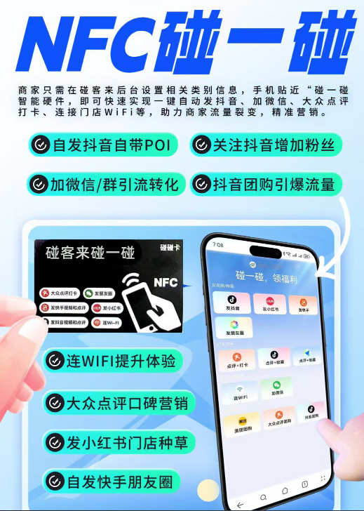 1:手机NFC碰一下就可以转发视频或图文 2:支持【抖喑、筷手、小红薯、视频号、大众店铺、美团点评、朋友⭕️转发、WiFi自动连接 】8个平台 3:同时支持手机扫码转发功能 4:自动剪辑视频 5:自动AI合成音乐 6:自动AI生成文案 7:同城流量曝光 8:挂载POI地址