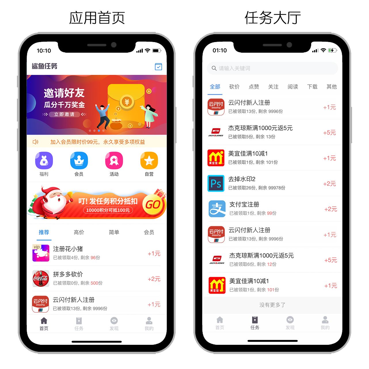 鲨鱼任务悬赏系统有H5、小程序、安卓、苹果4个端, 共用同一套后台,数据互通。每个端3888元,多买多优惠。本程序是我们自主开发,不依赖第三方系统,已申请软件著作权。