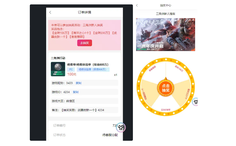 - 增加订单抽奖活动,后台管理抽奖奖品和爆率,商品绑定抽奖活动后,用户购买该商品,将在订单详情可以参加抽奖,中奖后,会把奖品写入订单备注,打手看到后赠送奖励。
