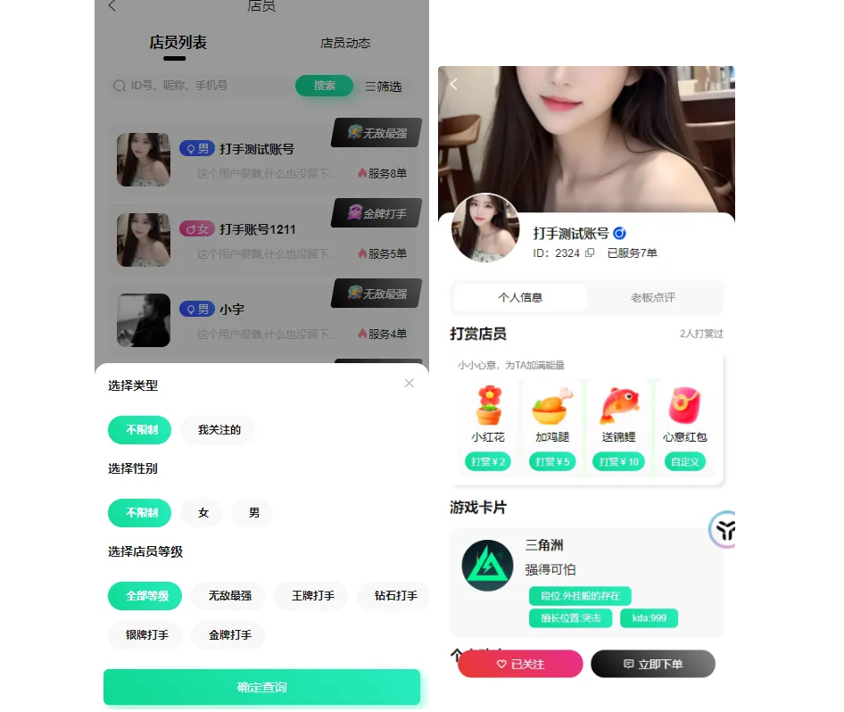 - 增加打手列表和打手动态频道,打手将后个人主页,可以对打手进行打赏,主页有头像和背景图 游戏卡片 点评、动态等。可以关注打手和直接找打手下单。