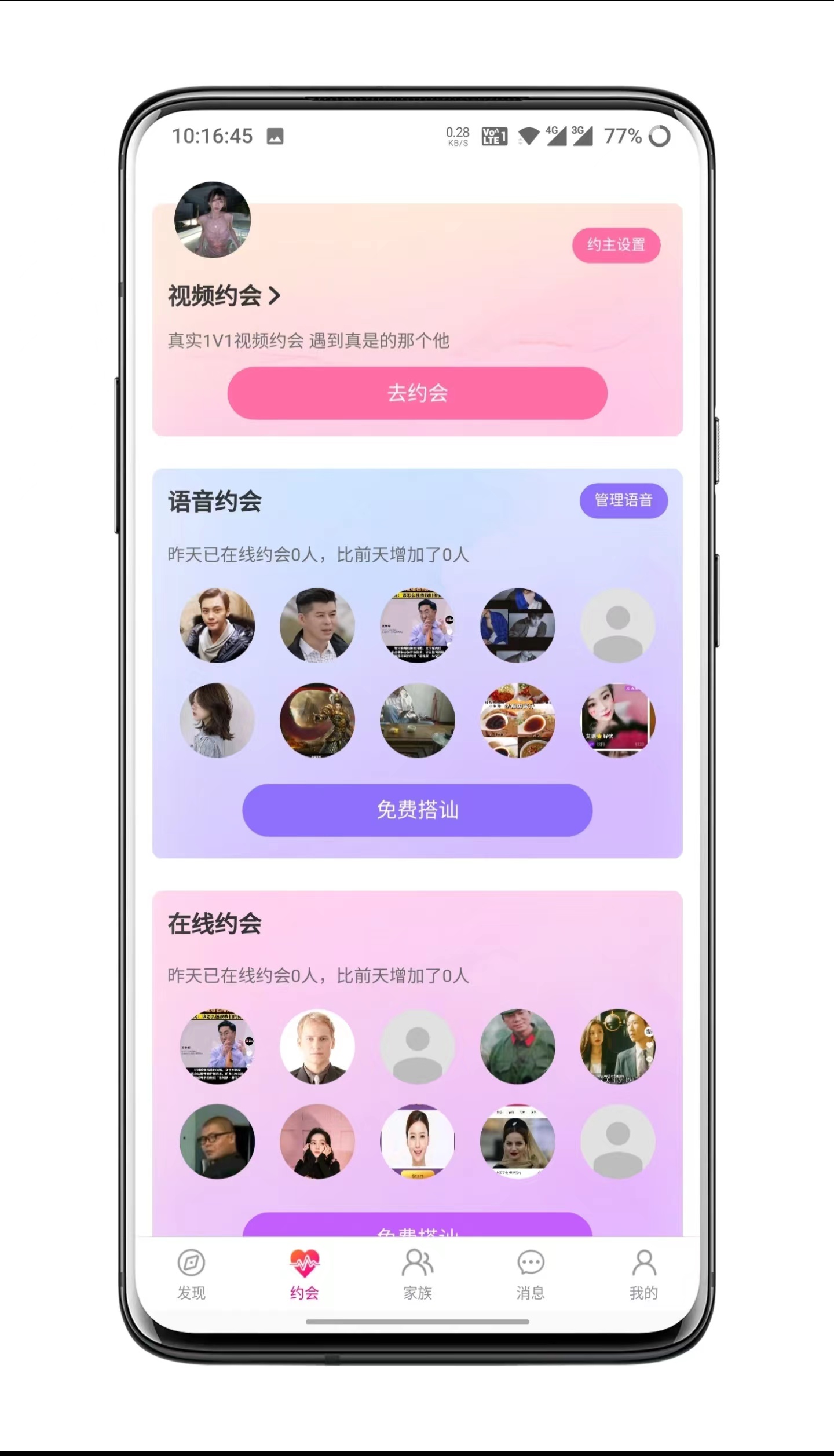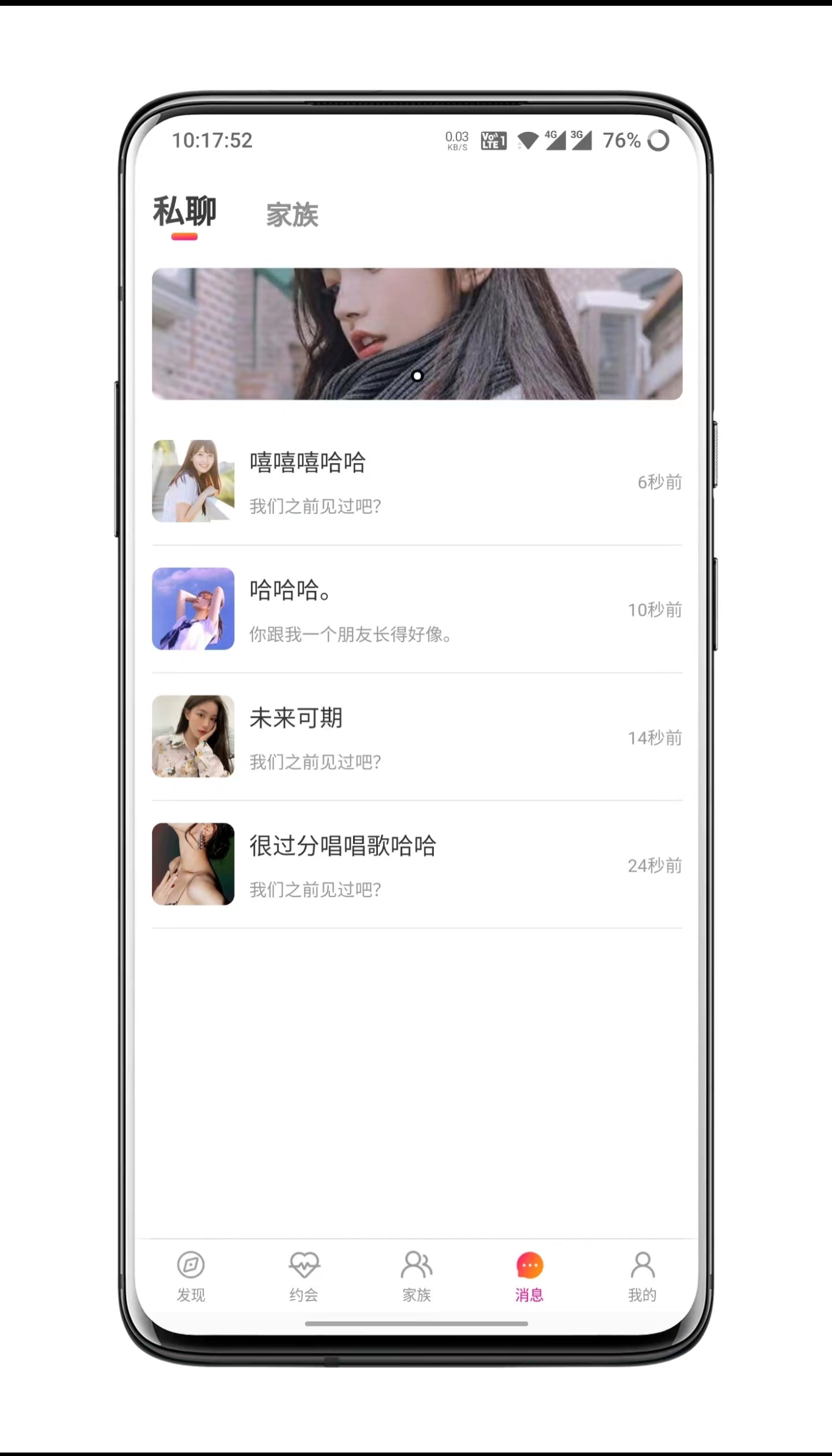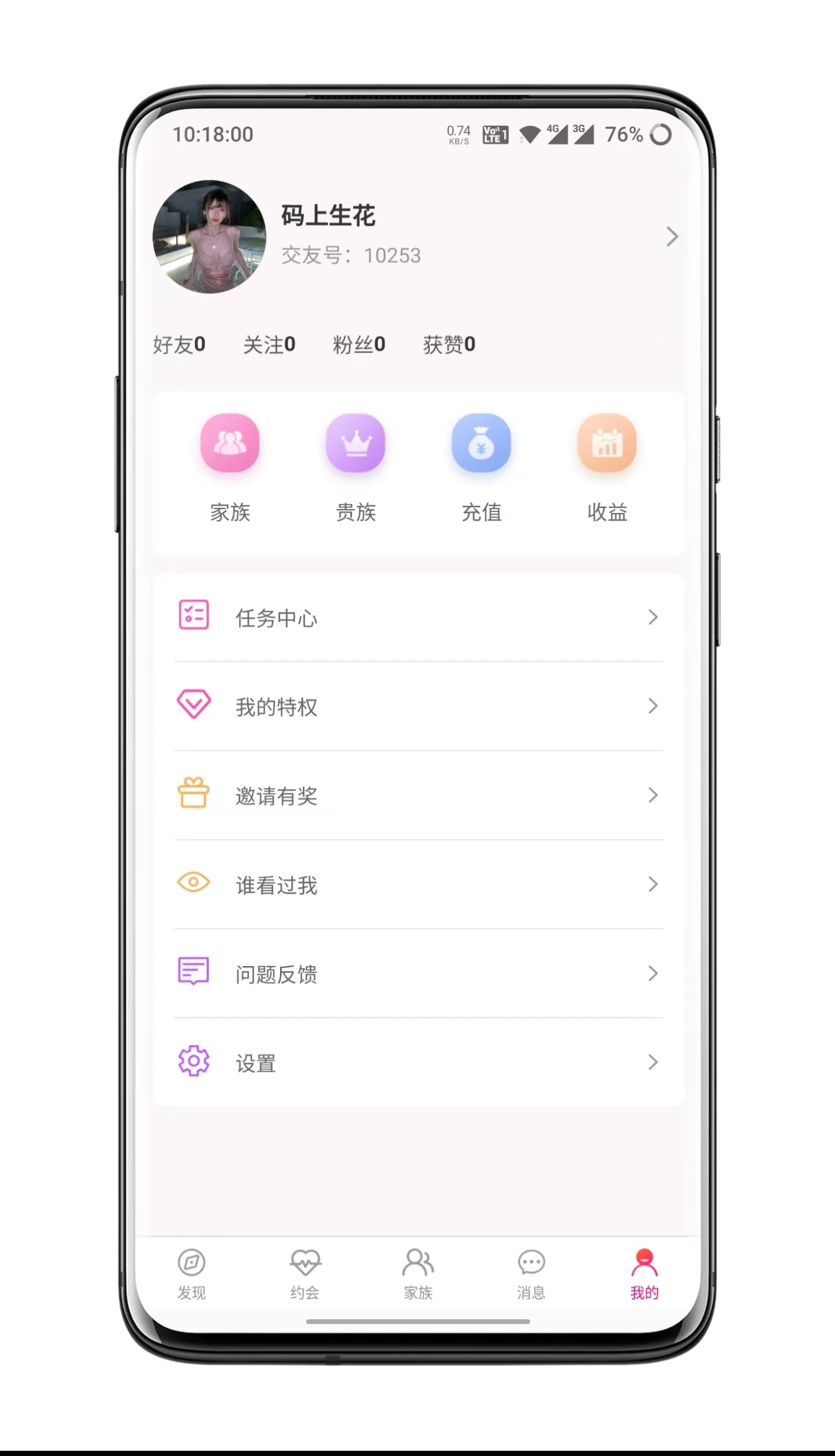 6、消息:分为私聊和家族消息。1、私聊,可赠送礼物,可充值金币,视频聊天,语音聊天,发送文字和图片。2、家族除了可赠送礼物,语音,视频,图文聊天外还可以发红包