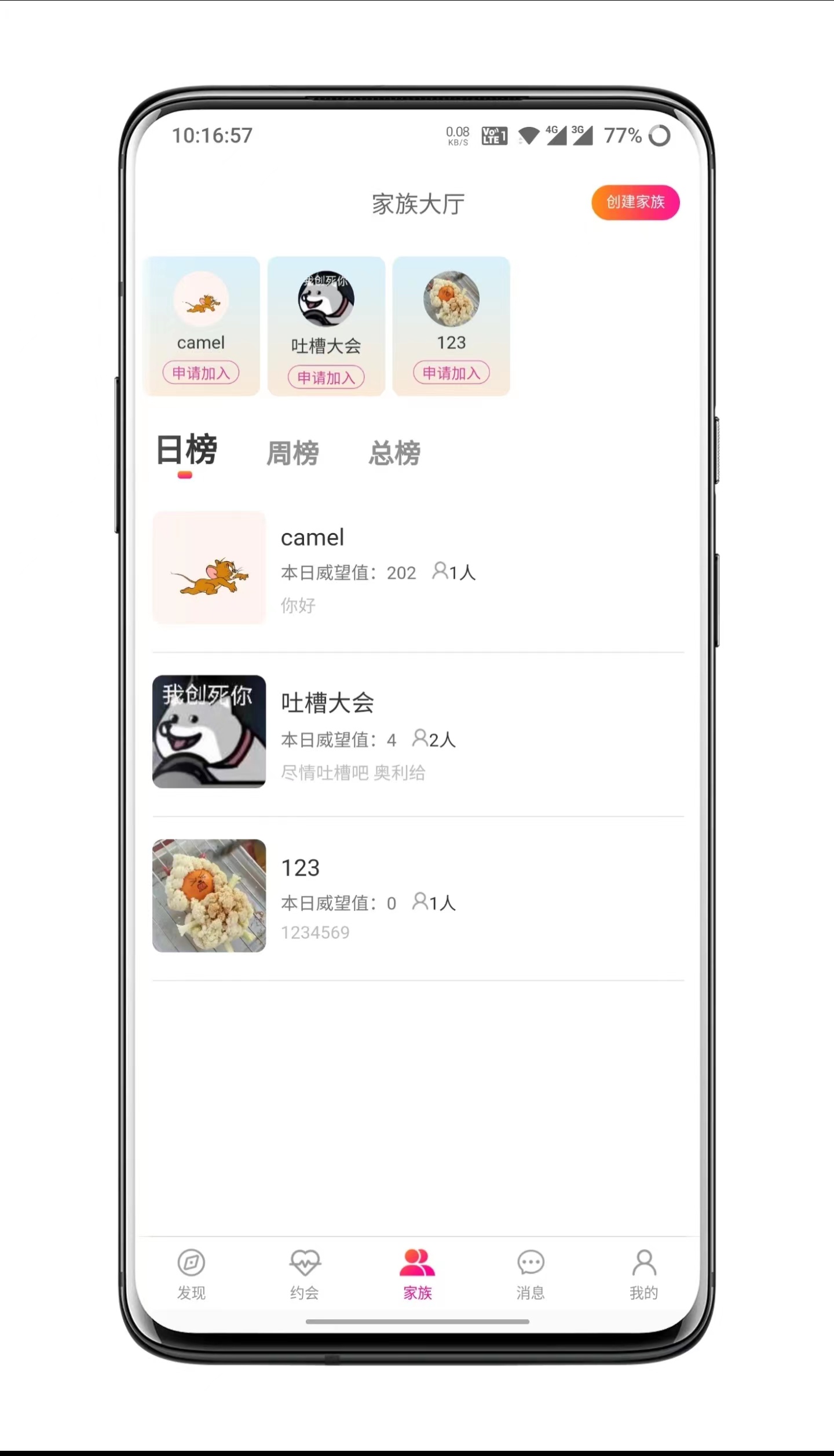 5、家族大厅:家族列表显示,威望值排名,进入家族,家族主页成员显示,可以是游客身份进入,也可以填写申请理由,申请加入。可创建家族