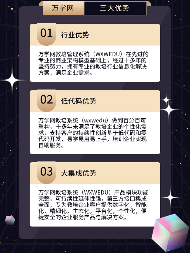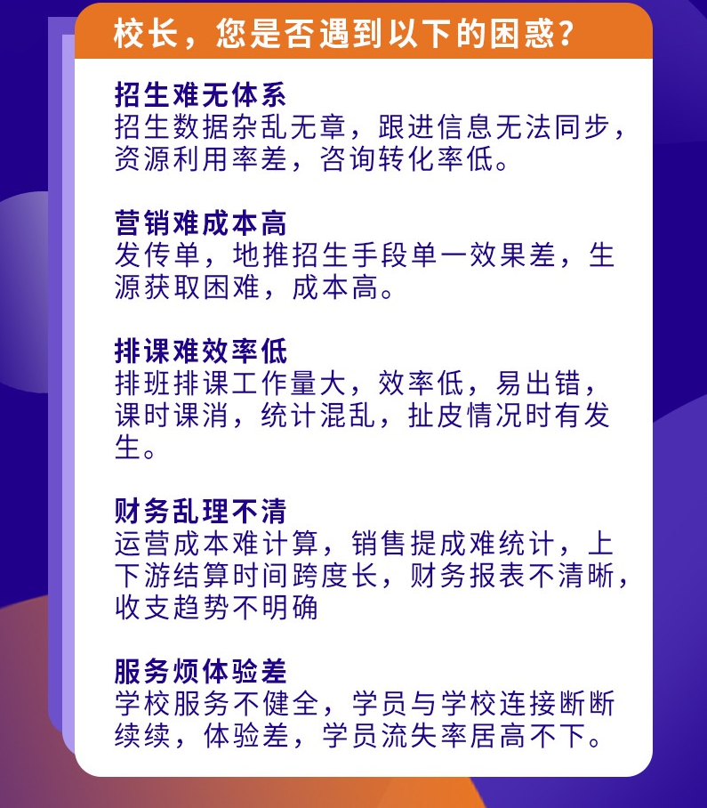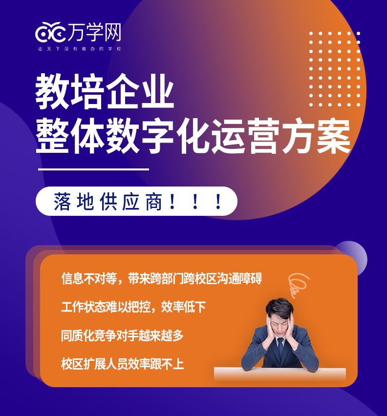 那么教育培训机构在管理中还存在很多问题,特别企业规模在50人以上的公司来说。存在很多管理混乱的情况,获客成本是越来越高动辄一个有效的成本达到了1000块的时候损失一个客户更让老板头痛。比如:学员信息管理混乱,依然靠文档或者表格的形式存放,学员 (万学网OA系统 万学网OA软件)信息容易丟失;学员较多时,会加大排课工作量:教师和学员难免存在请假调课情况,可能存在考勤记录不明情况;学生学费和教师课时费计算起来也费吋费力,后期银各种原因退学退费问题,和他问题导致学生与企业产生纠纷。针对这些问题,教育培训机构OA办公系统提供灵活的功能模块来满足使用要求。wxwedu