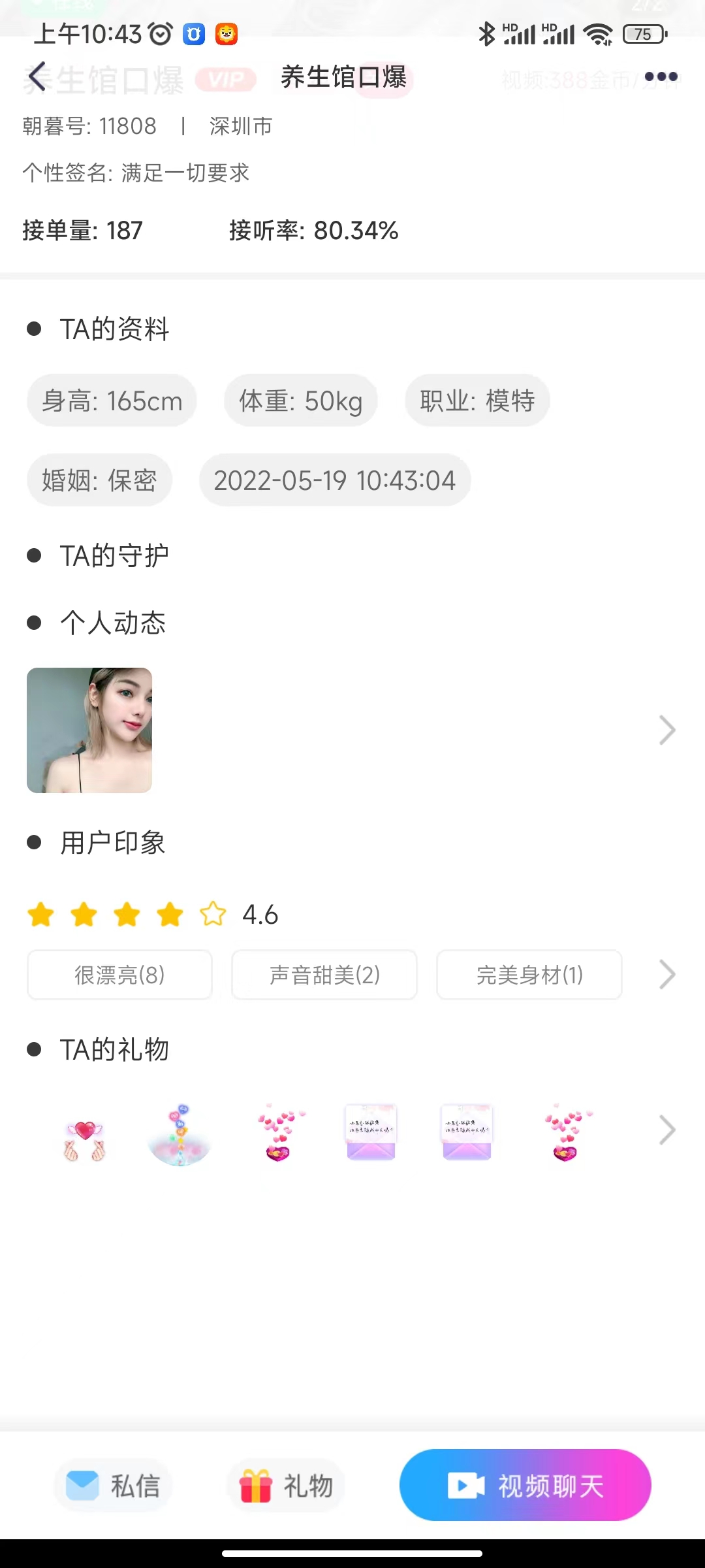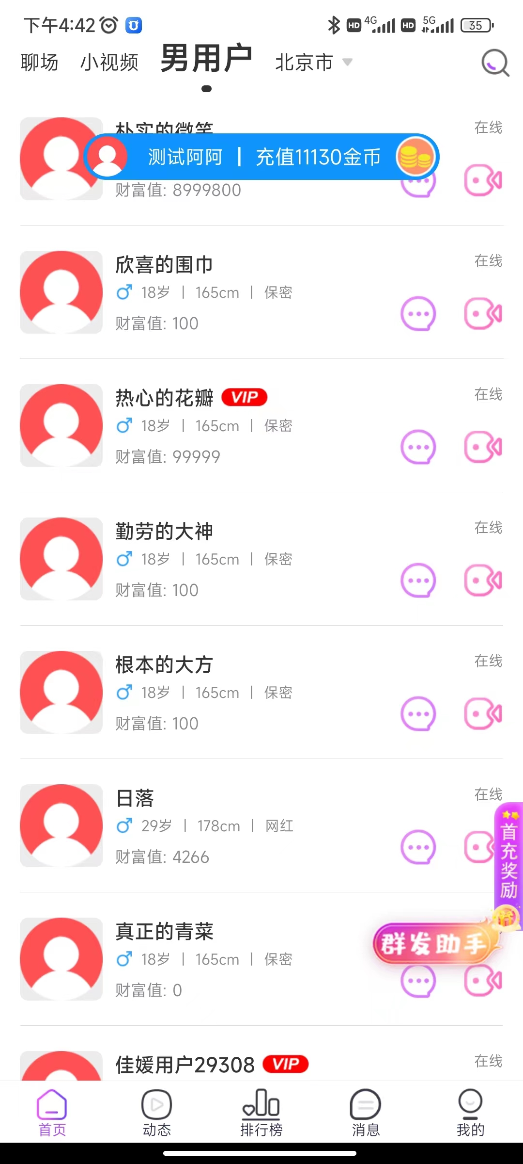 首页:查看主播用户、搜索主播用户、查看关注主播、、查看用户资料、查看用户私照和主播小视频、查看手机号微信、发私信和视频功能、赠送礼物