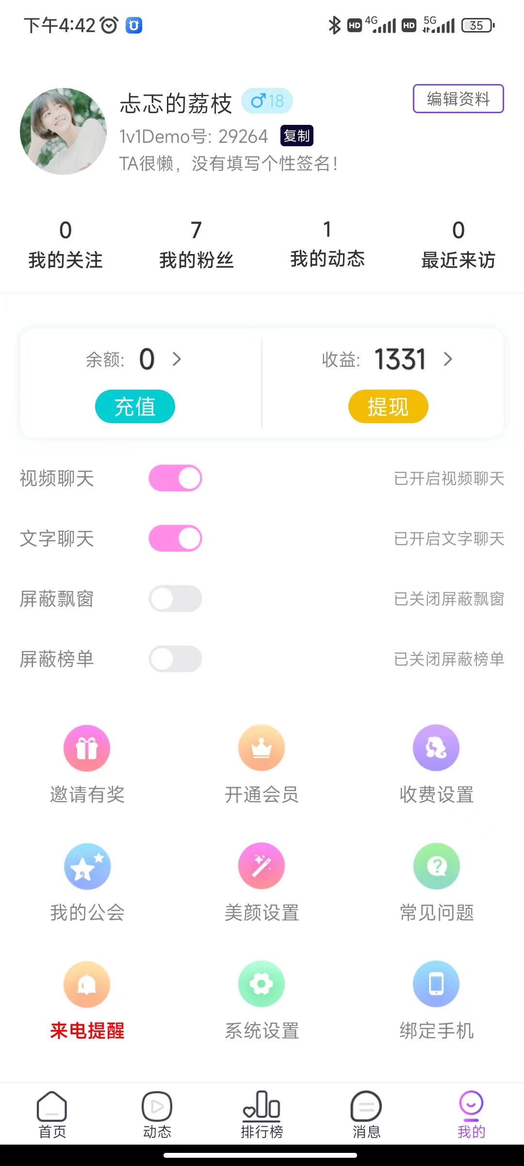 个人设置:上传用户头像、修改个人资料、查看关注用户、申请主播、上传私照、充值账户钻石、充值会员、领取后台赠送的红包、收益提现、邀请好友、推广明细、创建或加入公会、设置消息免打扰、联系客服、查看用户黑名单、退出登入、设置直播间按时收费价格。详细功能与操作方法见演示APP。