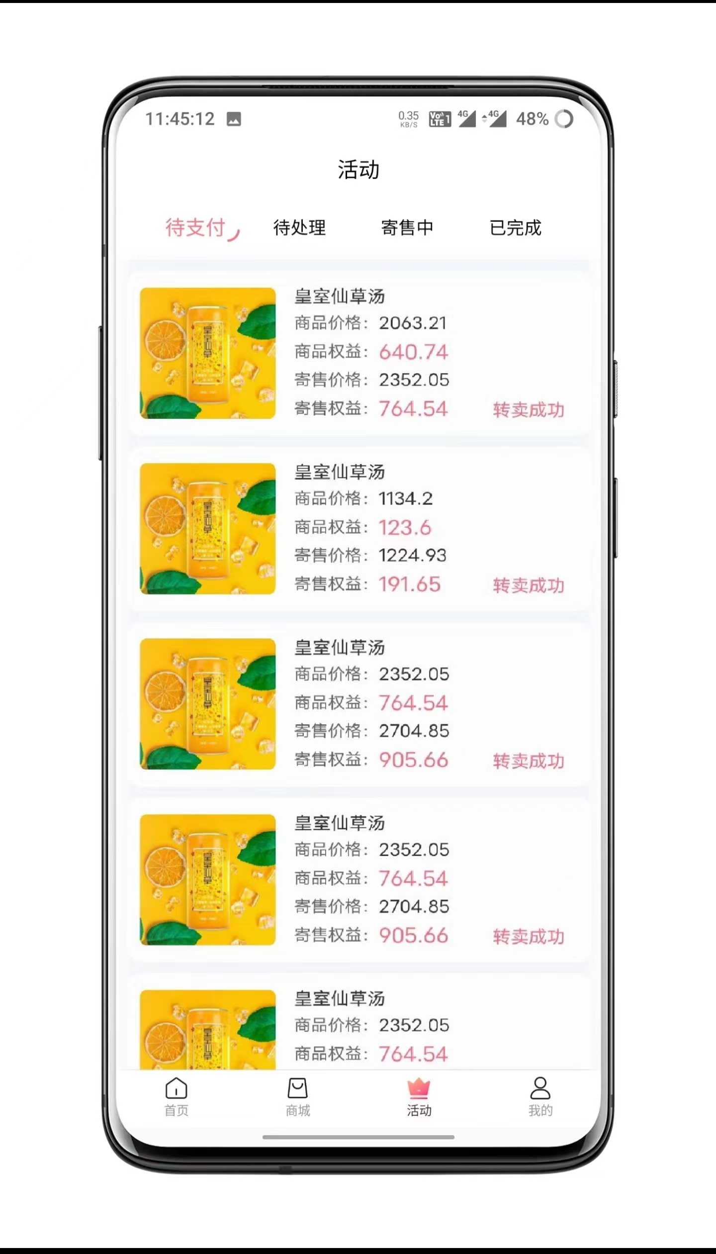 当用户抢购到订单后,并支付成功,一键寄售转卖;溢价进行转卖。转售需要 4.5%的广告值,第二天广告值变成现金,委托“寄售”成功,等待卖出。