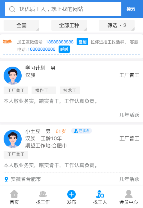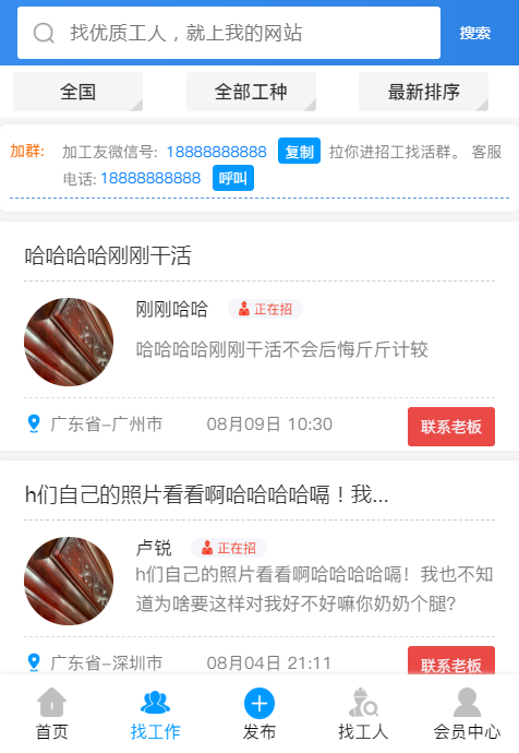 工地发布招工信息,工人发布找活名片信息,查看联系方式需要消耗积分、置顶刷新也需要使用积分、积分可充值、可以查看积分获取和消耗记录,也可以通过要求好友注册来获取积分,可以查看谁看过我,和我看过谁的记录,还有资讯动态,实名认证、实名查询等功能,后台可以审核查看和编辑这些信息、发布资讯动态、设置刷新置顶查看联系方式的消耗积分、设置注册和邀请的赠送积分、充值比例设置、轮播图、首页分类图标和连接设置等。