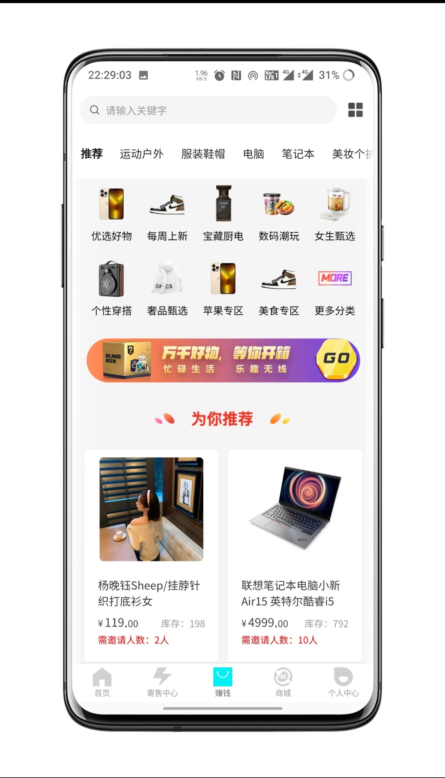 赚钱玩法,邀请一定好友数得商品,顶部轮播图展示、产品类别分类、每周上新、更多分类