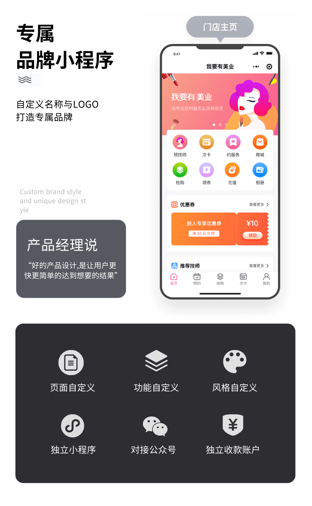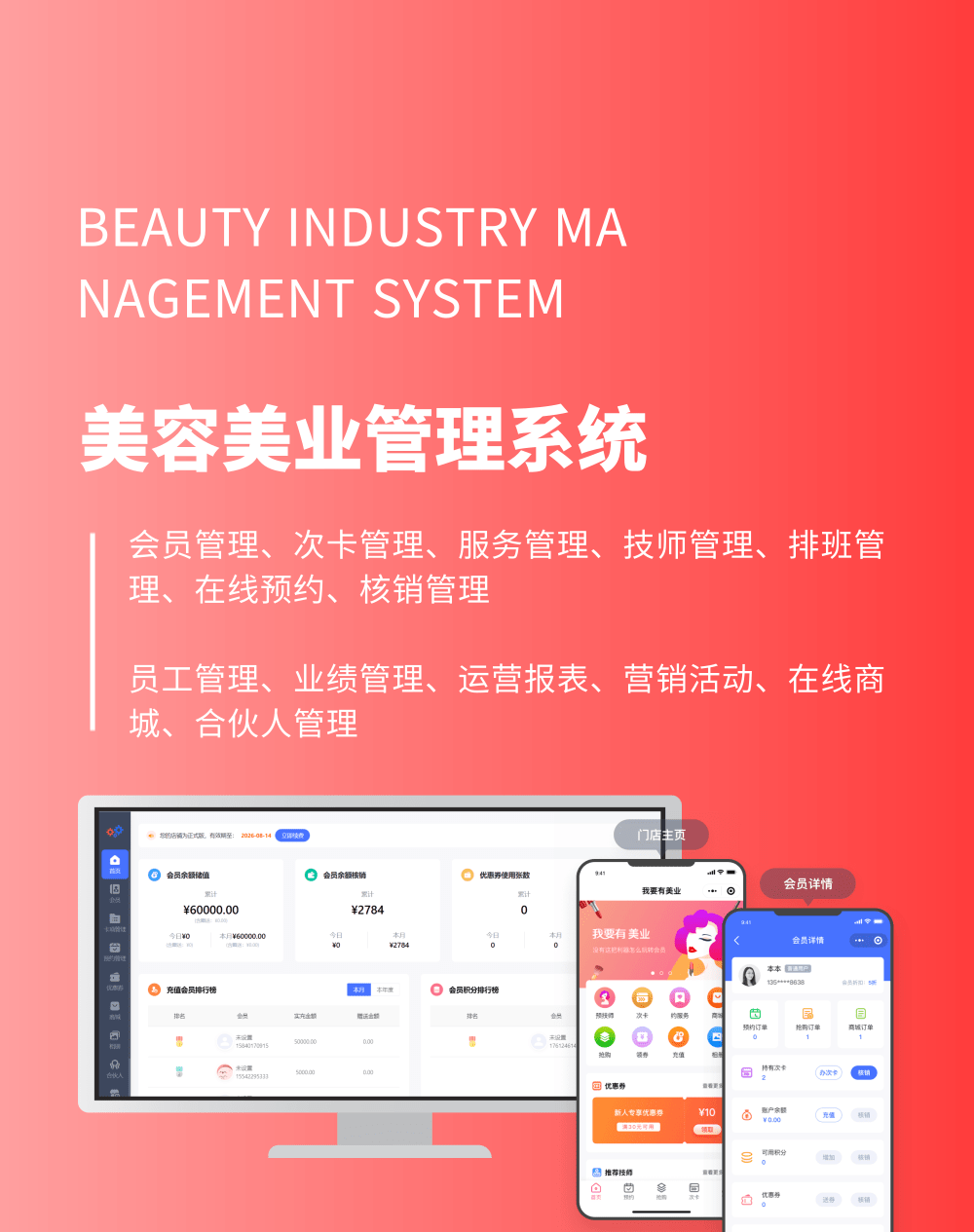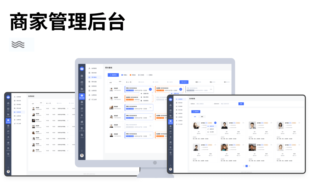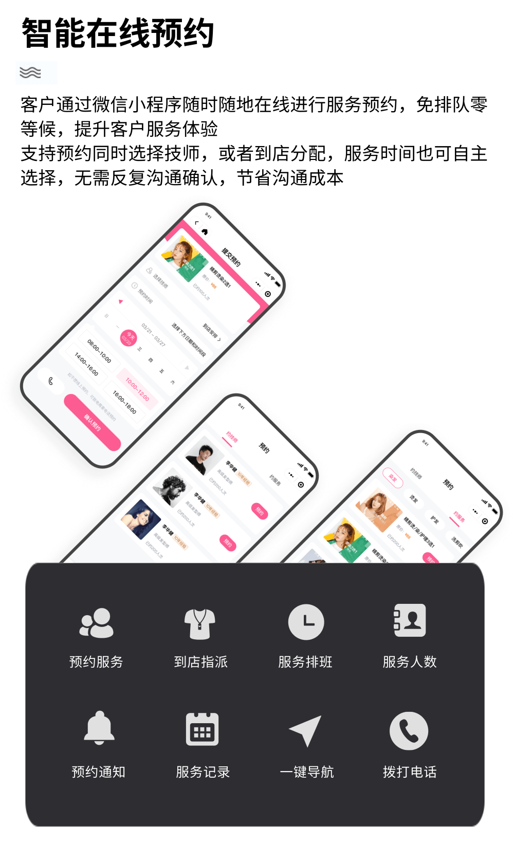 会员管理、次卡管理、服务管理、技师管理、排班管理、技师预约、核销管理、员工管理、业绩管理、运营报表、营销活动