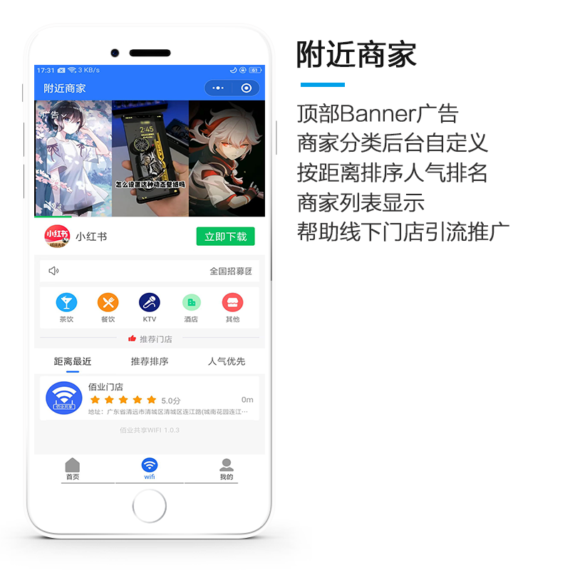 5、附近商家:同城商家流量池共享,专门的商家类目,用于商家入驻,入驻后显示附近商家,实现同城流量共享,平台可以收取商家入驻费用等。打造吃喝玩乐为一体的平台。
