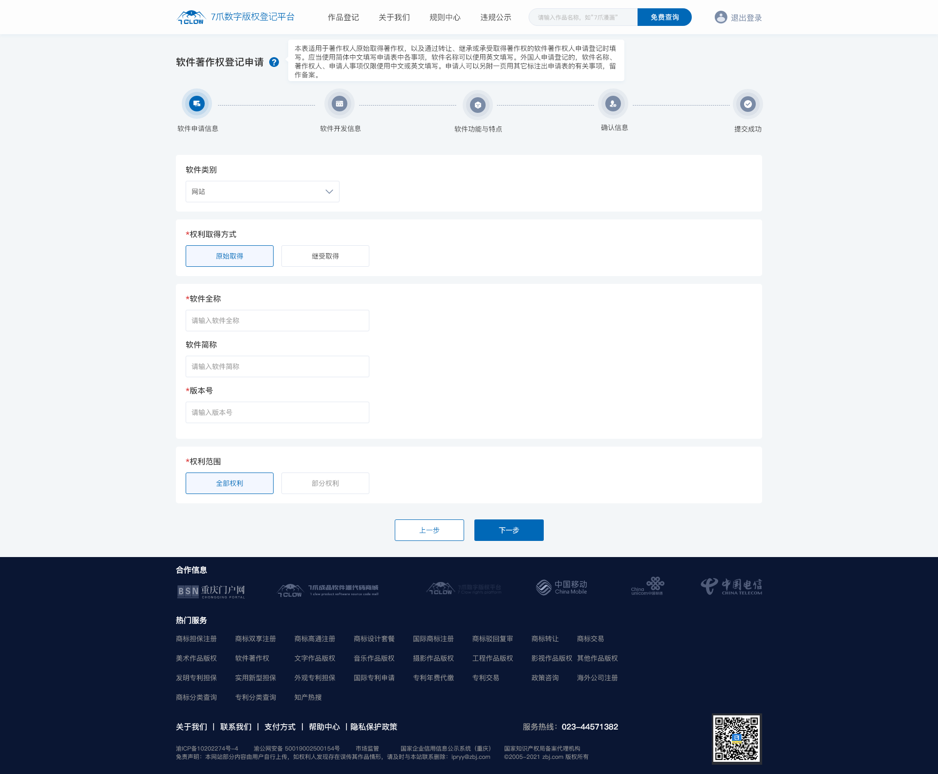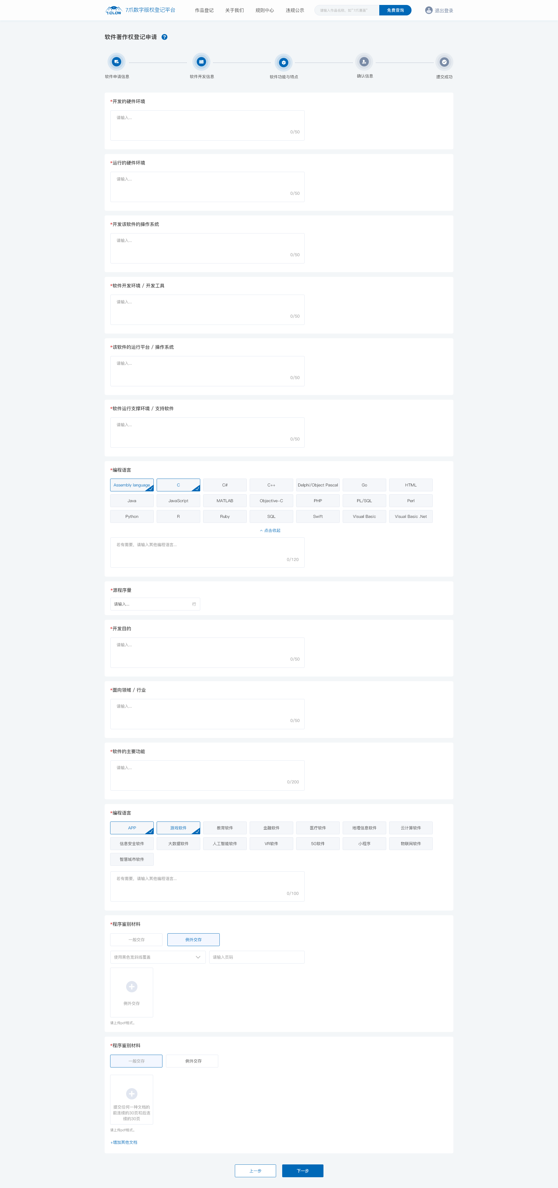 选择机构 选择登记信息 认证信息 软件著作权登记 软件开发信息 登记信息特点 筛选作品类别 作品权属信息 软件登记状态 自动生成证书