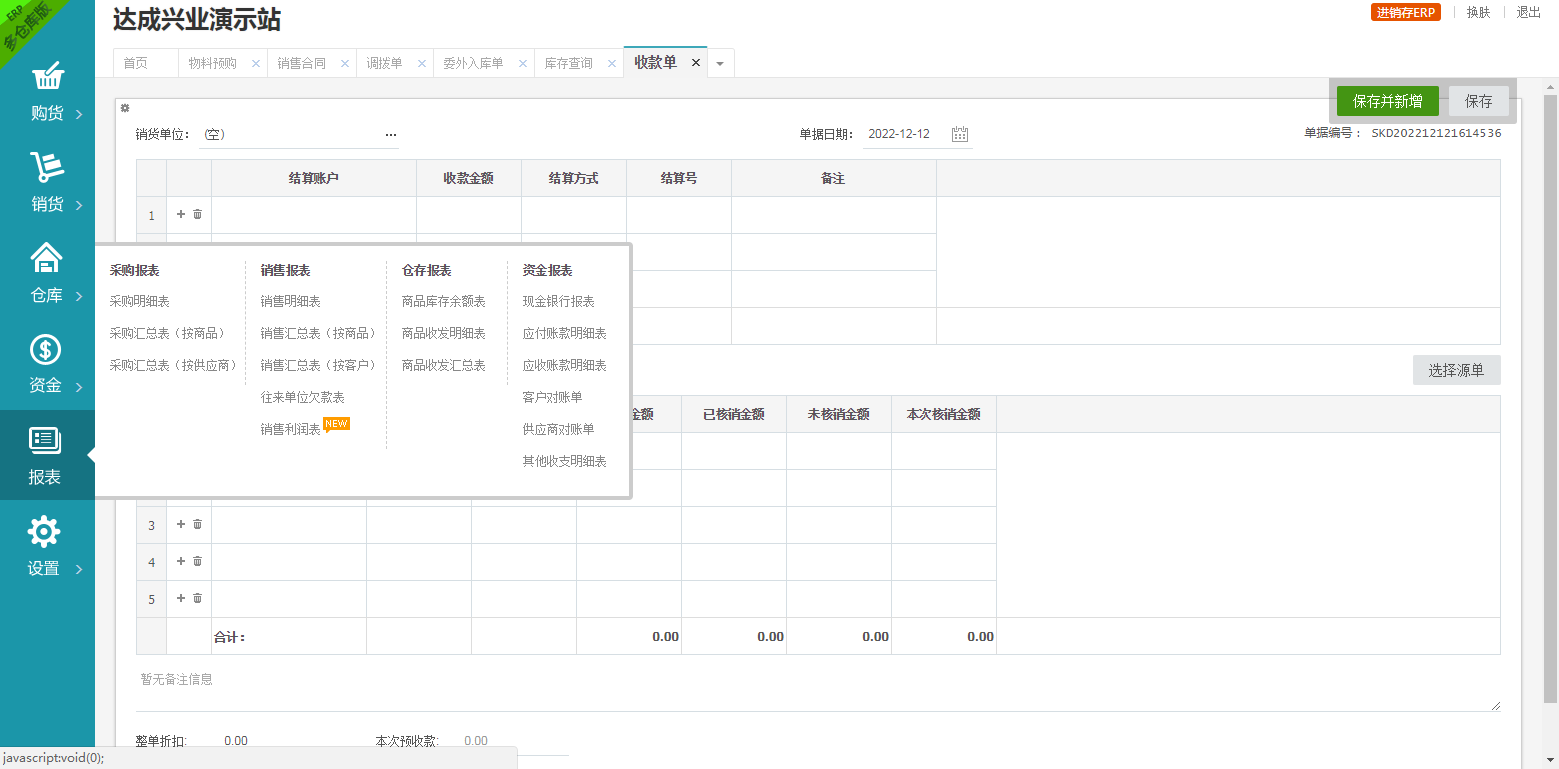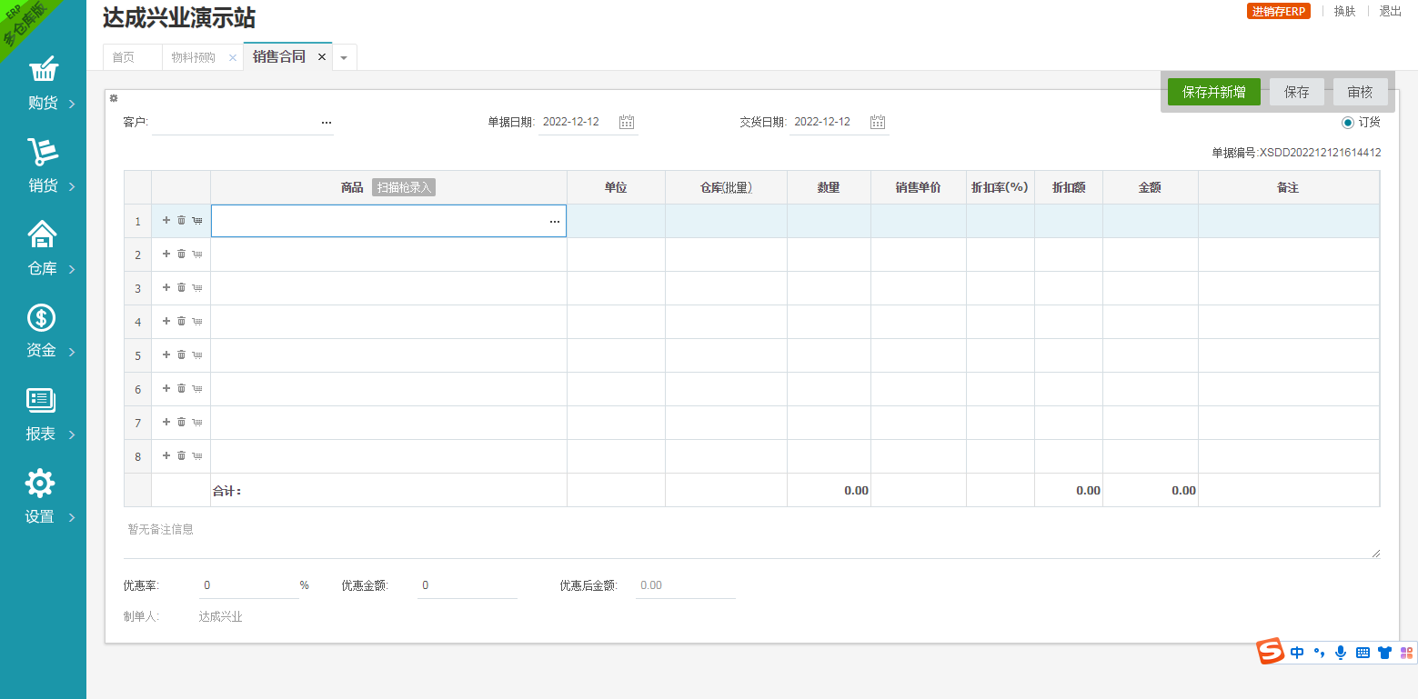 - 销货分支:销售合同,销售出库单,销售退货单。