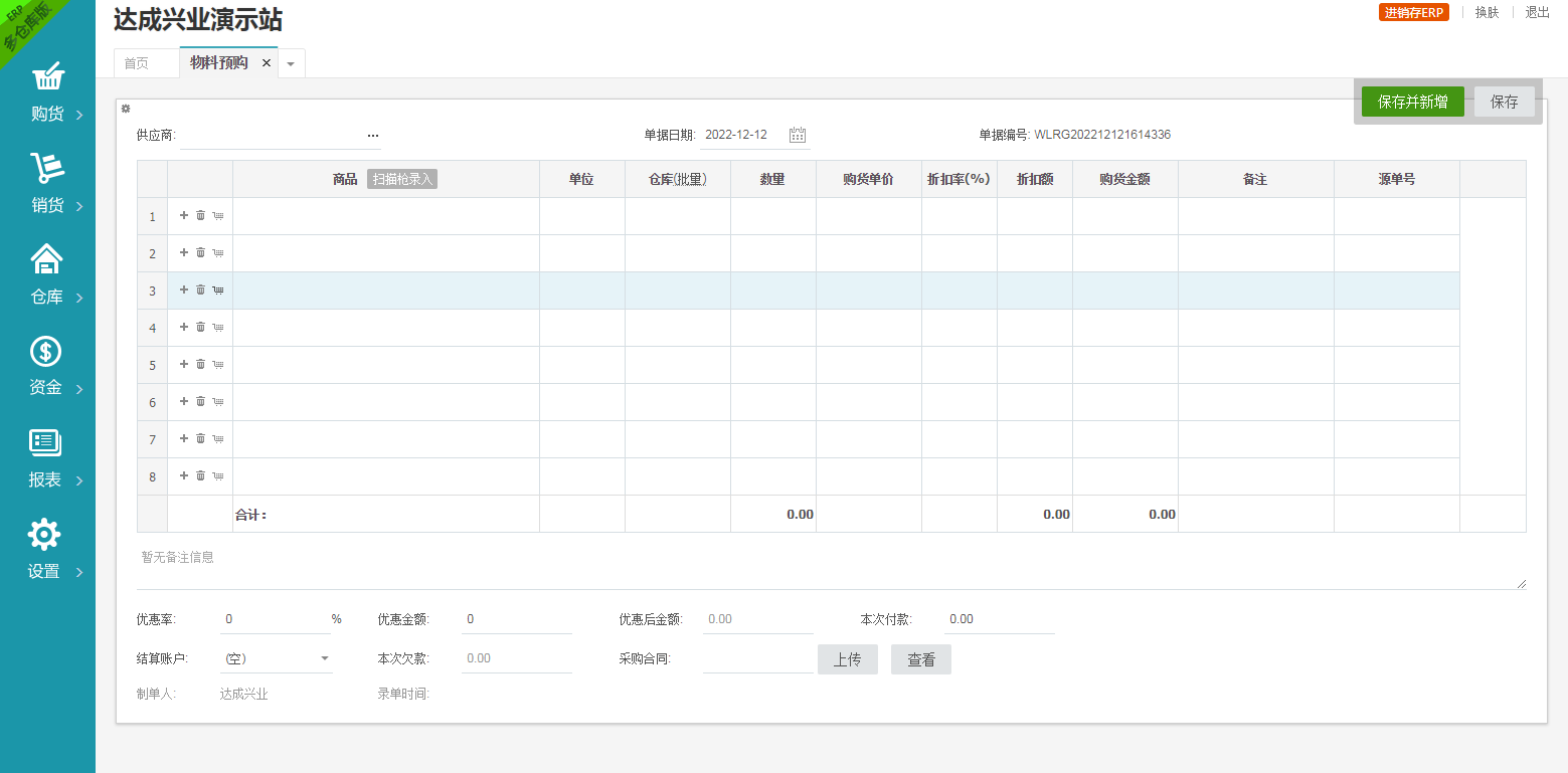 - 购货分支:物料预购,采购入库单,购货退货单。