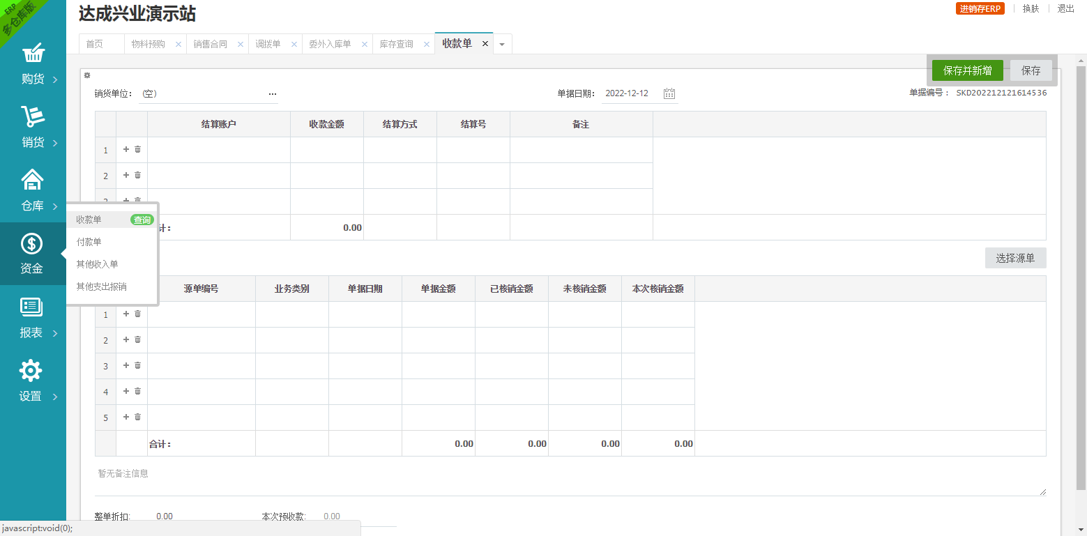 - 资金分支:收款单,付款单,其他收入单,其他支出报销。