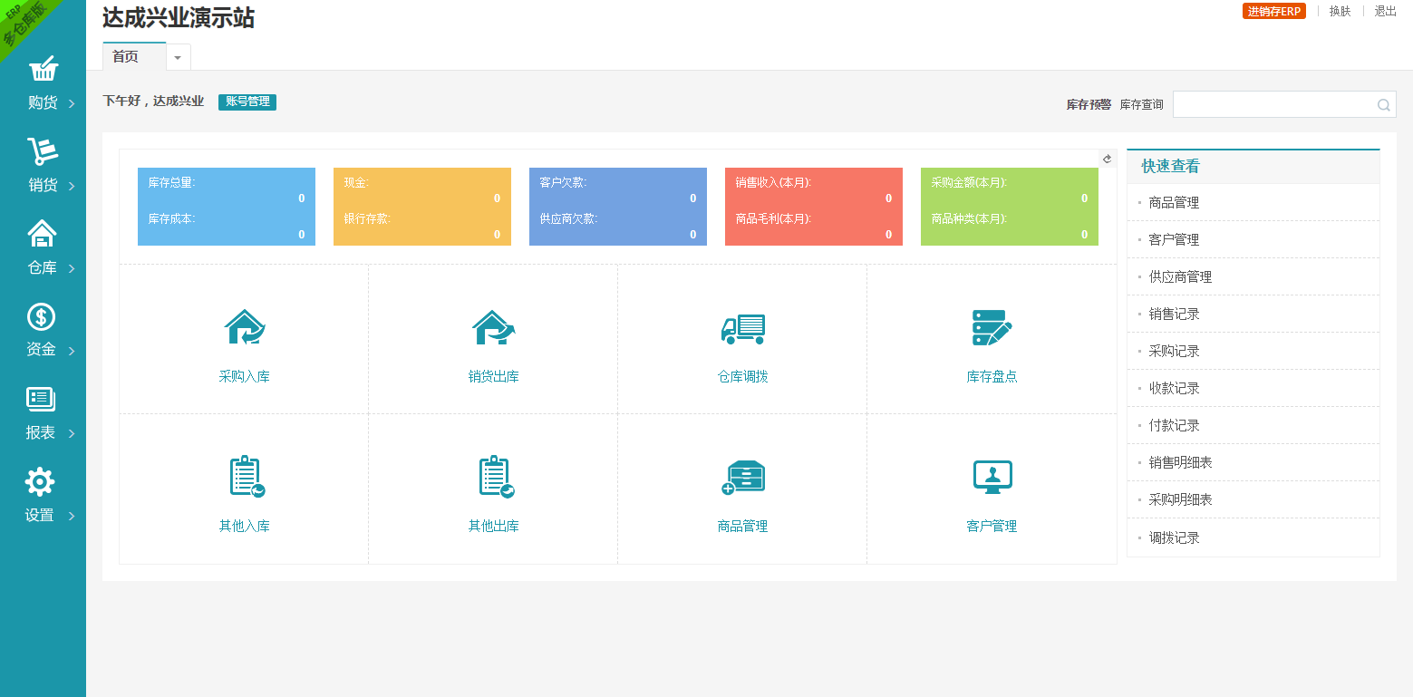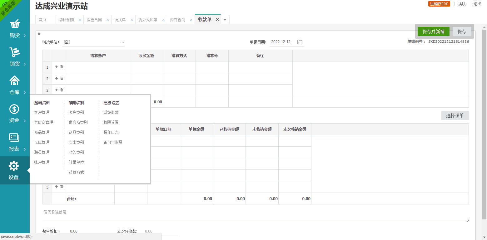- 设置分支:⑴基础资料:客户管理,供应商管理,商品管理,仓库管理,职员管理,账户管理。⑵辅助资料:客户类别,供应商类别,商品类别,支出类别,收入类别,计量单位,结算方式。⑶高级设置:系统参数,权限设置,操作日志,备份与回复。