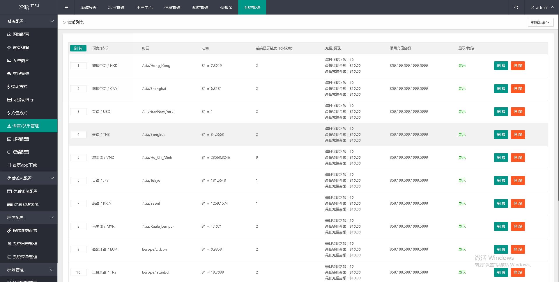 7、可根据所选语言,显示对应货币资金金额,对接了汇率接口,自动更新汇率