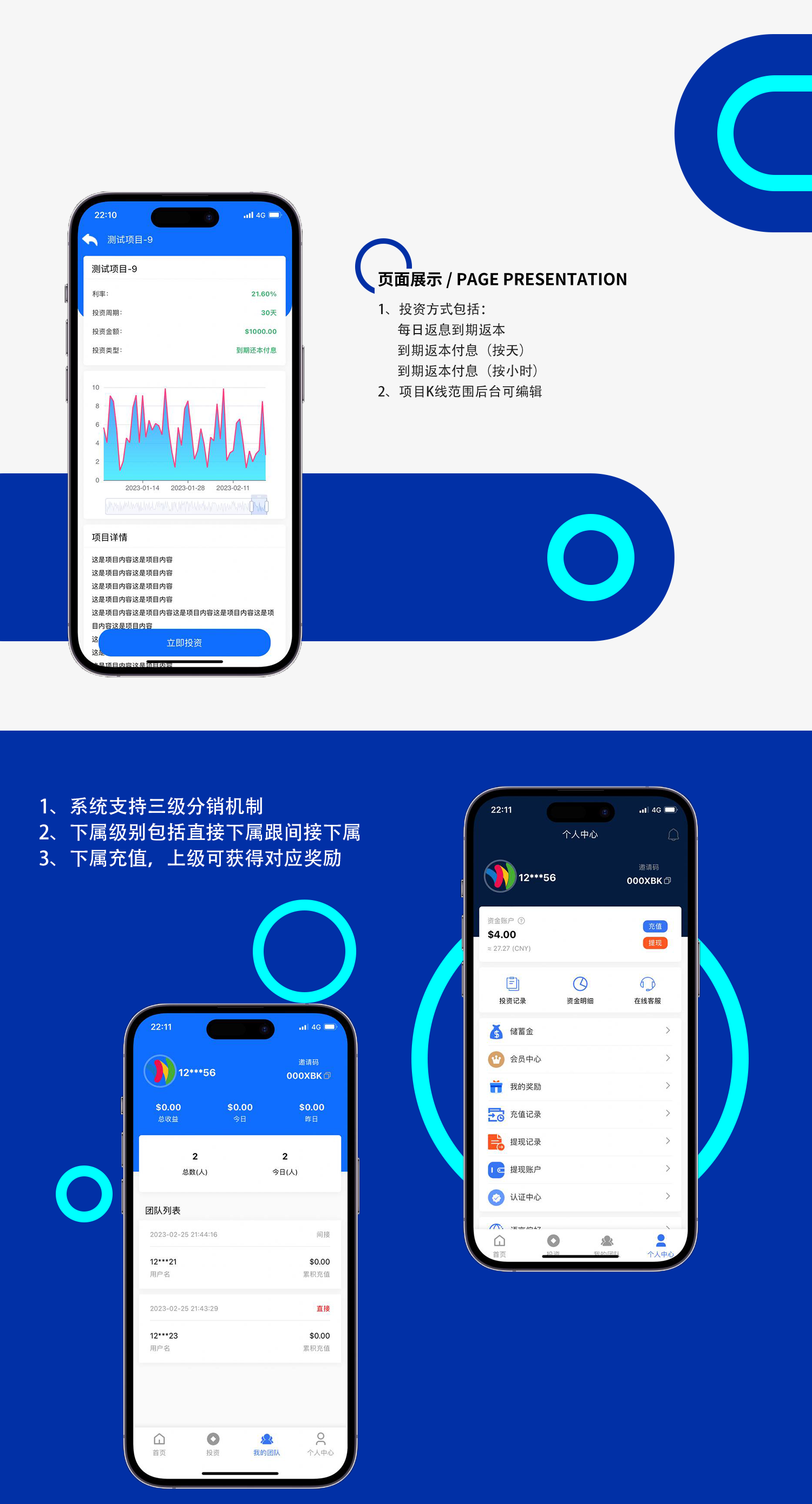 2、根据法规需求,仅支持三级分销机制,用户邀请朋友能获得对应百分比奖励