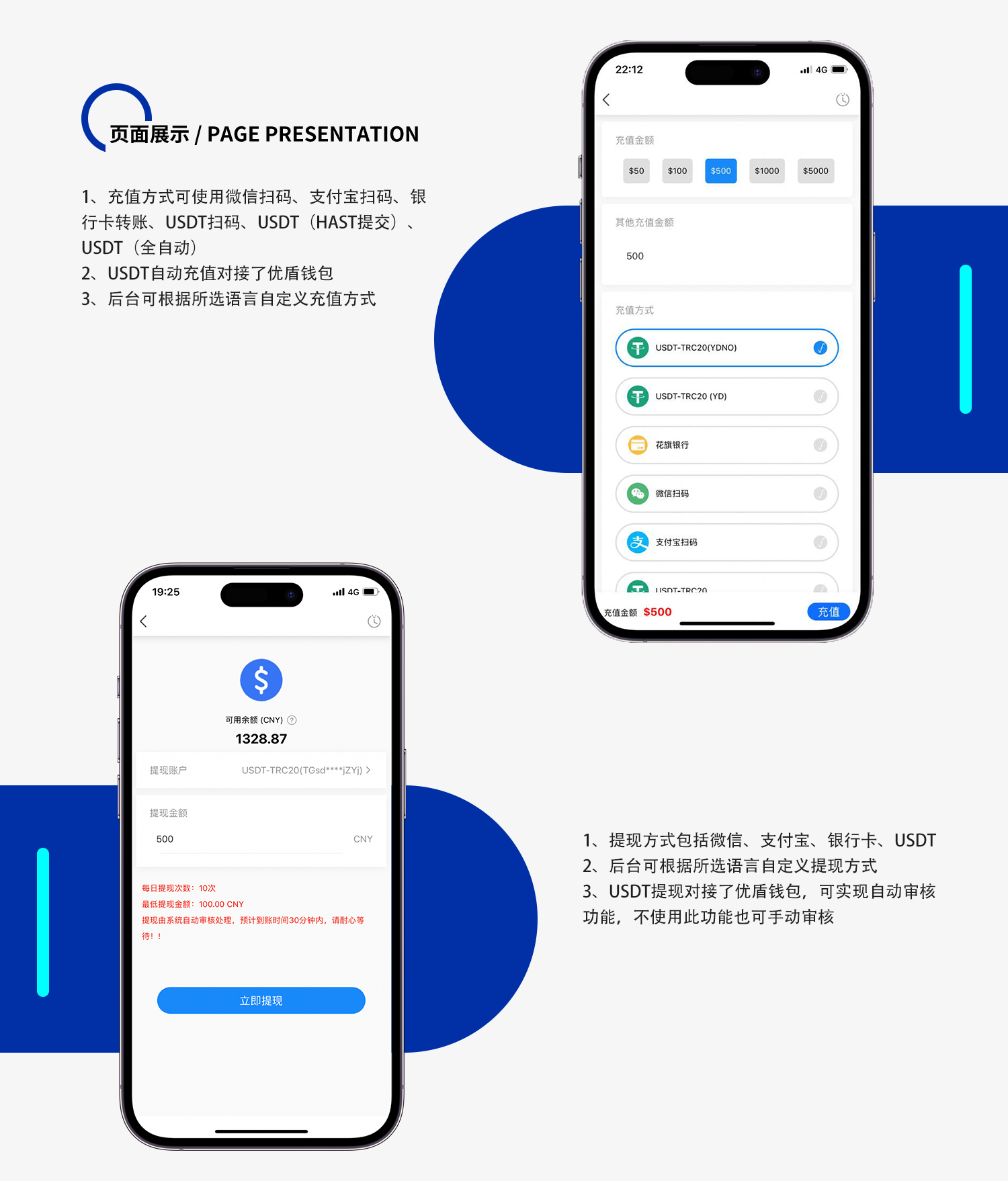 充值功能:微信扫码、支付宝扫码、银行卡转账、USDT转账、优盾USDT(手动、自动到账,USDT自动充提需升级优盾钱包套餐)。