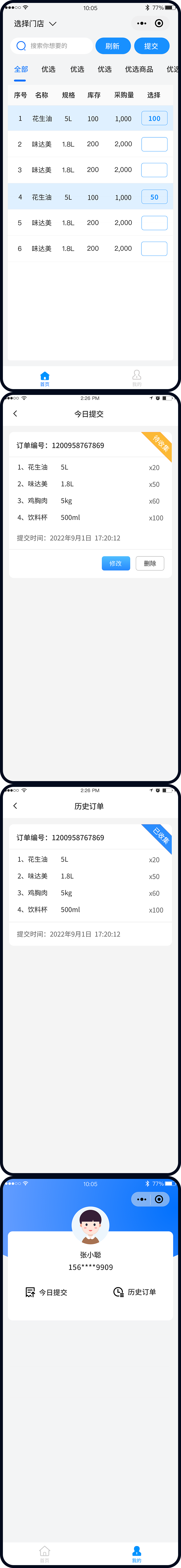 3,报货。分店查看小程序上所有商品信息,点击其中一个商品(需要有分类)进行报货。类似于下单,下单后,出现待提交列表。可以一键提交。