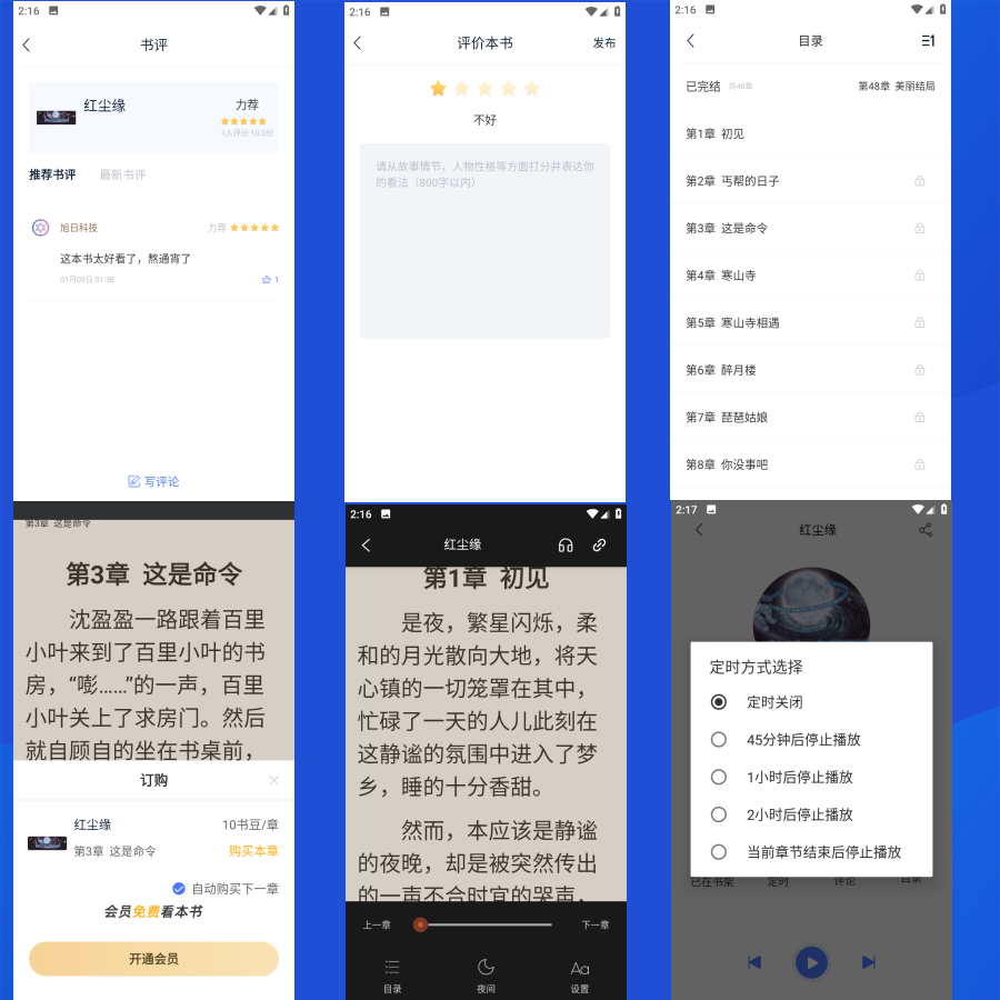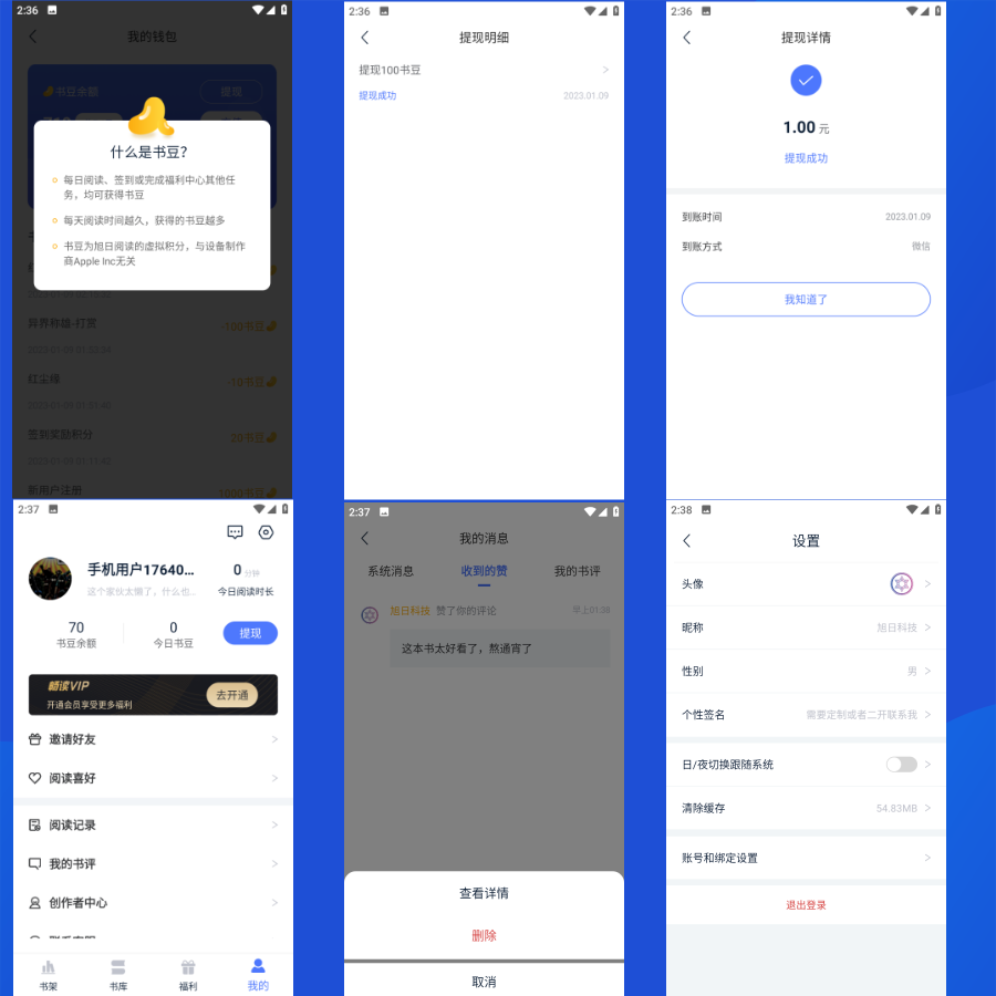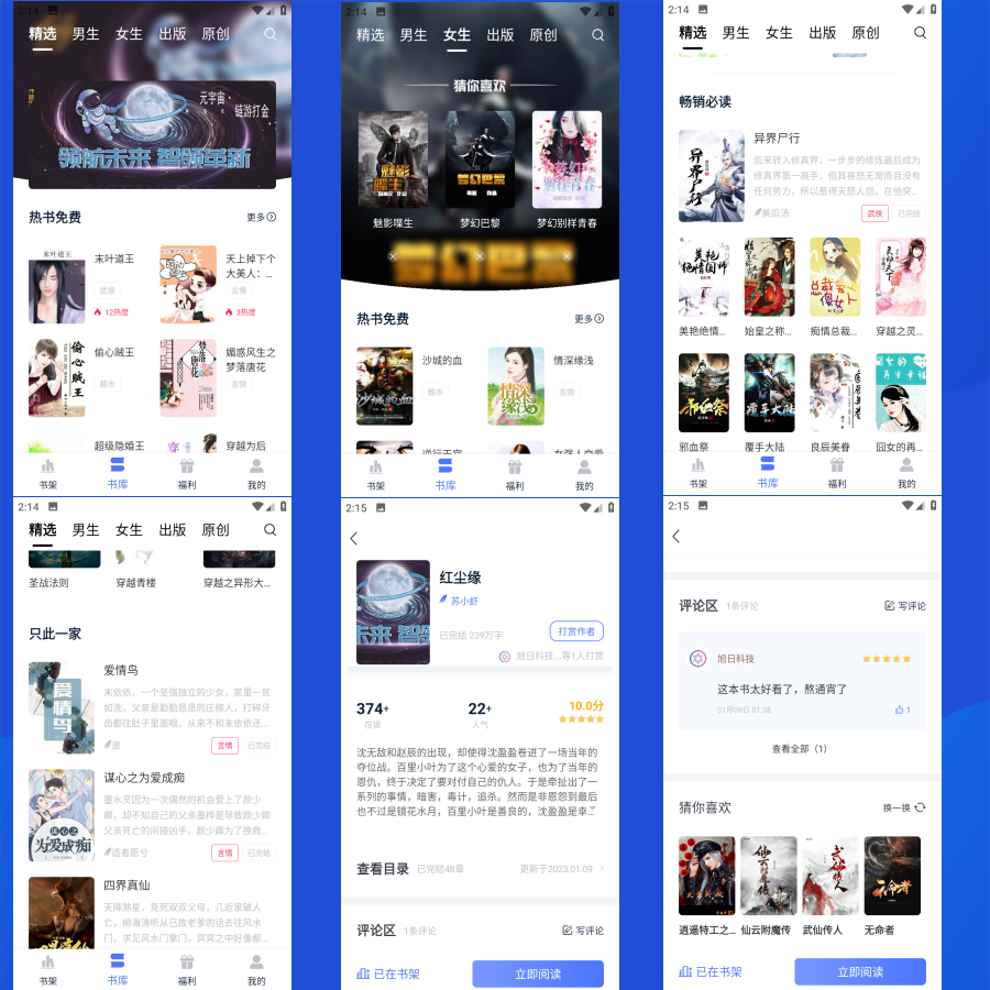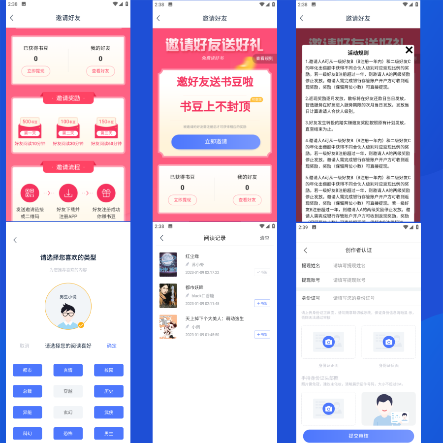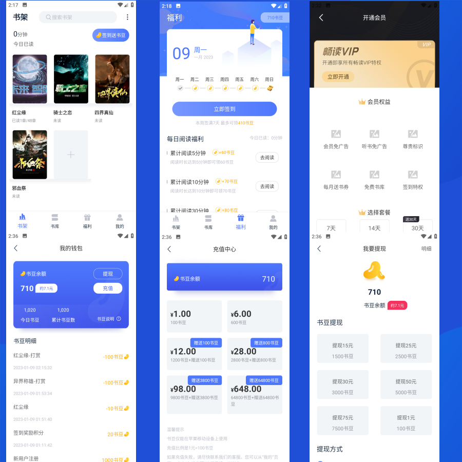 书架+签到+任务+搜索+猜你喜欢+免费阅读+付费阅读+开通VIP+SDK广告+听书+打赏作者+评论+充值+第三方登录+手机号注册账号密码+手机短信一键登录+邀请好友+分销+作者申请 作者后台发布书源完整流程+渠道商+代理商分站+分包+扣量+设置分成完整一套体系。 +公众号端+短链接推广更多功能联系客服QQ 9067676详聊