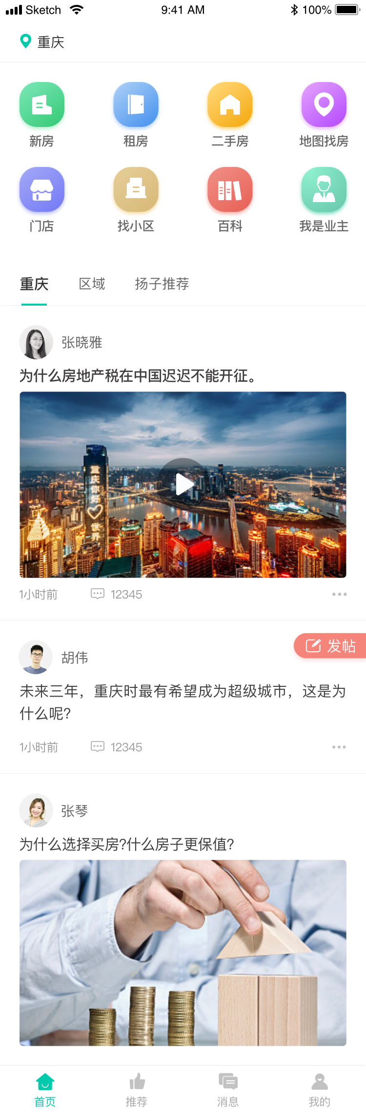 新房 租房 二手房 地图找房 找门店 找小区 百科资讯 业主发布卖房出租房 带动态发帖。圈子。 带私聊 评论 回复 点赞 带经纪人可以私聊 房屋详情带地图周边配套